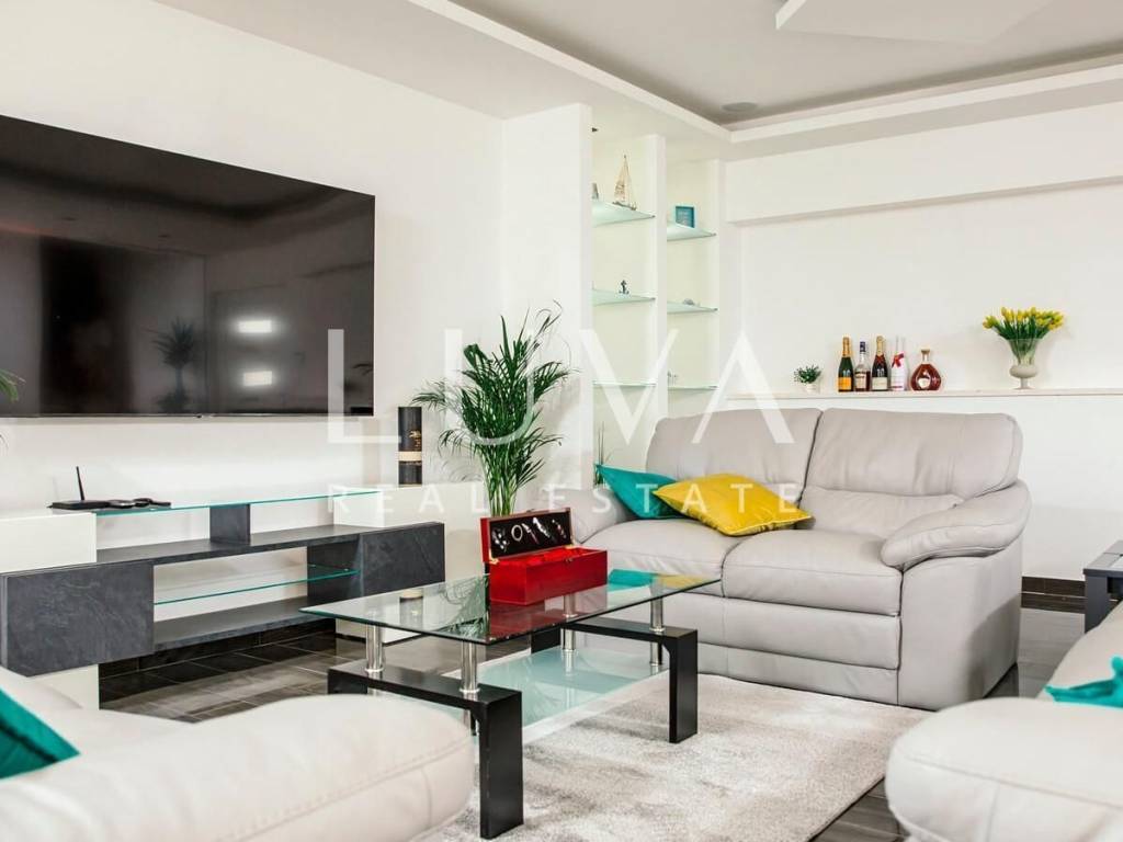 A luxury house for sale with a swimming pool near the sea in Podstrana, near Split. The property extends over 3 floors and contains 4 bedrooms and 3 bathrooms. On the last floor there is a master bedroom with an ensuite bathroom and a beautiful view of the sea. On the first floor there are 3 bedrooms and a large terrace with a Jacuzzi. On the ground floor there is a spacious living room, kitchen, and guest toilet. There is an outdoor swimming pool in front of the house, and the house has a garage and 2 parking spaces.
