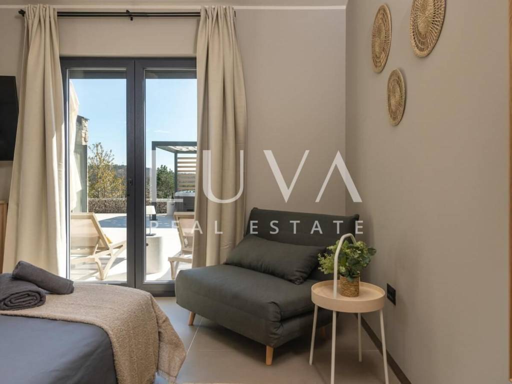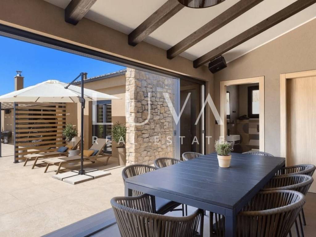 Luxury house with pool for sale near the small peaceful town of Hum, in Istria. The house has 130 m², 2 bedrooms, 2 bathrooms, and a spacious living room with a fireplace. Both bedrooms are air-conditioned, have their own bathroom, and a TV. Built in 2022, the house sits on a 1750 m² estate and includes a pool and an outdoor Jacuzzi next to the pool. The house features an additional covered outdoor kitchen with a barbecue and a sauna inside the house. In front of the house, there are 2 covered parking spaces and a charger for electric cars.