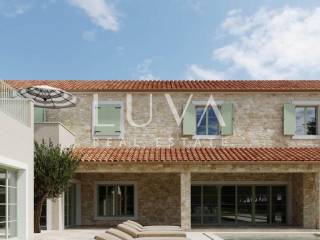 A luxury villa with a pool is under construction and is expected to be completed by May 2026. The villa is located in Buje, on the western coast of Istria. It will be built on a large elevated plot of 4,000 m², offering stunning panoramic views of the sea and surroundings. The exterior of the villa will feature a traditional style with stone walls, a sloping roof with tiles, and charming wooden shutters, while the interior will be designed in a more modern style. The villa will have a total area of 350 m², spread across 2 floors. The ground floor will include a living room, kitchen, and a wellness area with a sauna and Jacuzzi. All these rooms will open onto a beautifully landscaped garden with a large outdoor pool. Additionally, there will be a small apartment with a separate entrance intended for staff on the ground floor. The first floor will feature 4 bedrooms, each with its own bathroom, while the master bedroom will have access to a spacious terrace. The villa will be equipped with the latest technology, such as a heat pump for heating/cooling, and will be furnished with designer furniture.