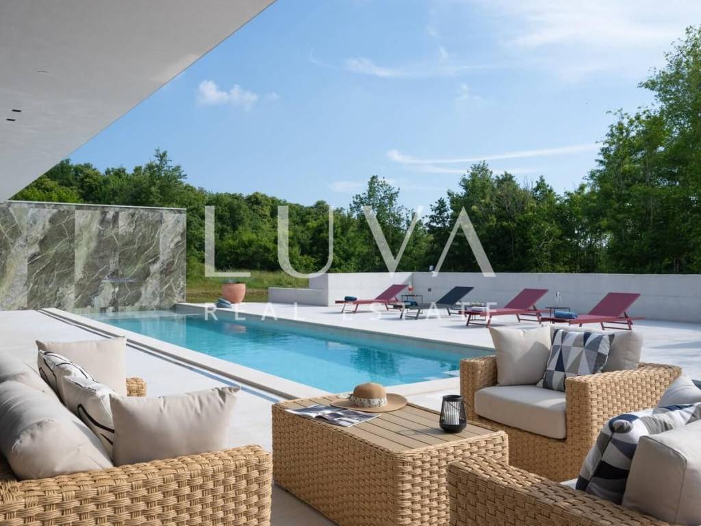A luxurious villa with a pool is for sale in the small, peaceful village of Šterna, located in northern Istria, close to Buje and Grožnjan. Built in 2024, the villa spans 300 m2 over two floors. The ground floor features a spacious living room connected to a fully equipped kitchen and a modern fireplace that adds a special charm. Large glass doors open onto the outdoor terrace, where a large pool surrounded by loungers and greenery awaits. The villa has three spacious bedrooms, each with en-suite bathrooms and terraces. It is furnished with designer pieces such as Guzzini, Artemide, Ticino lighting, Florim Bologna wall panels, and Calligaris Italy furniture.