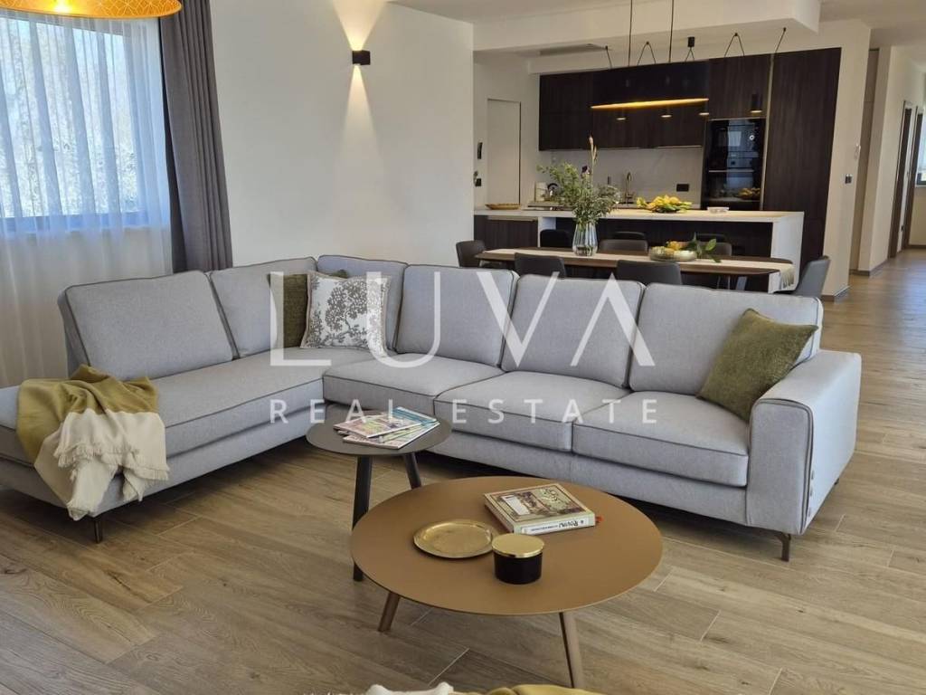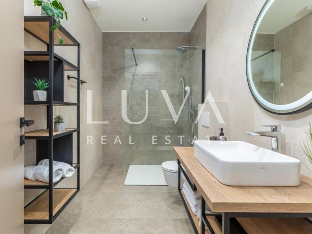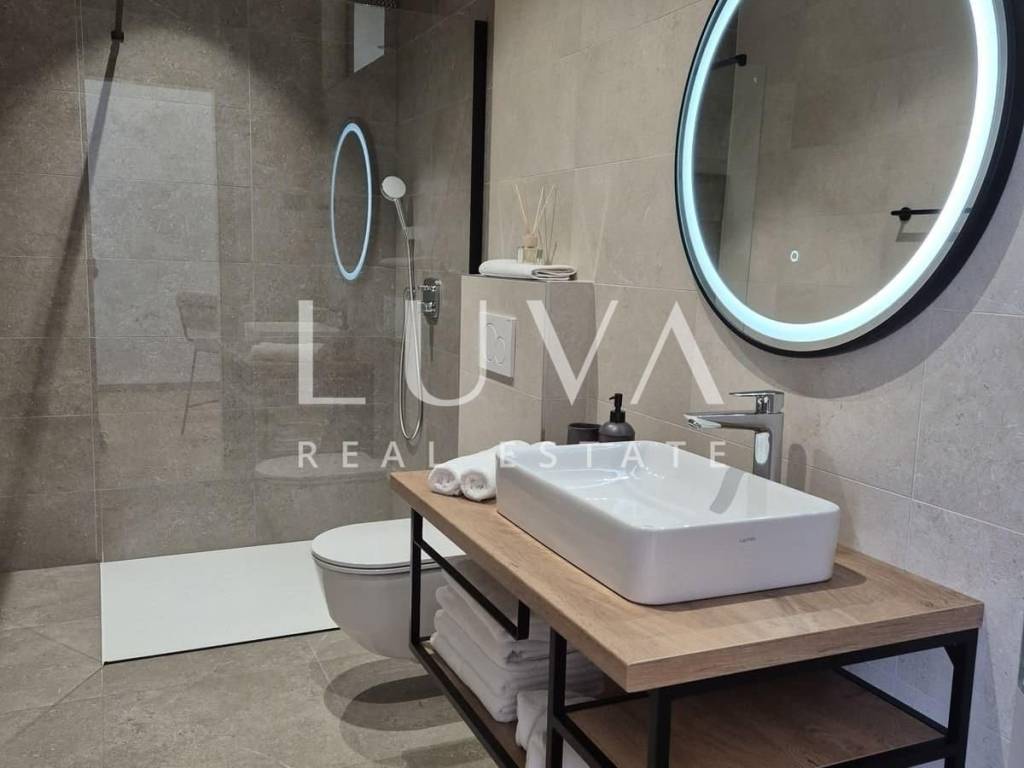 In the peaceful Istrian countryside, just 11 kilometers from the sea and the picturesque town of Rovinj, lies this modern villa that blends contemporary luxury with elements of traditional architecture. Inspired by local construction styles, the house features stone cladding, designer details, and a large covered terrace with a summer kitchen, creating a harmonious space ideal for year-round relaxation and living. The 40 m² infinity pool is set on a sun deck facing south and west, perfectly integrated into the landscaped garden filled with diverse vegetation that will provide natural shade and privacy over time.