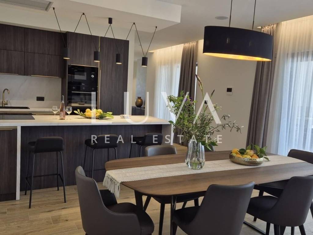 Built in 2024, the villa is equipped with modern systems – underfloor heating via a heat pump (Daikin), air conditioning, electric shutters, video surveillance, an alarm system, and contemporary furniture (partially included in the price, with the option to negotiate for additional furnishings). The façade combines stone, insulation, and brick, while the sloped roof is tiled. Interior surfaces are enhanced with high-quality ceramic tiles. The landscaped plot includes automatic irrigation, outdoor lighting, and four parking spaces. The entire property of 1,184 m² is fenced and features a motorized gate.
