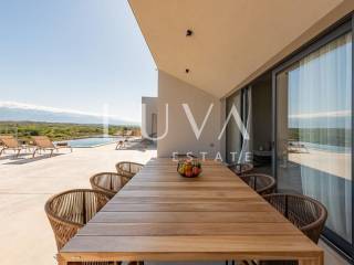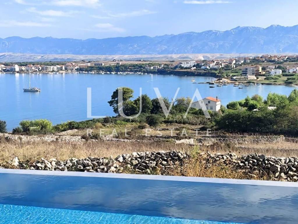 For sale: Modern luxury house with stunning sea views in Povljana, Pag Island. Built in 2024, this luxurious home is located just 400 meters from the sea and features a contemporary design with dominant concrete elements. The house spans 341 m² on a single floor and is set on a 1400 m² property. It boasts a spacious living room connected to a fully equipped kitchen, with glass walls opening onto a large terrace. The terrace includes an outdoor pool with a breathtaking sea view. Additionally, the house has four bedrooms, each with an en-suite bathroom, accommodating up to eight people comfortably. Parking is provided on-site, with a charger for electric vehicles.