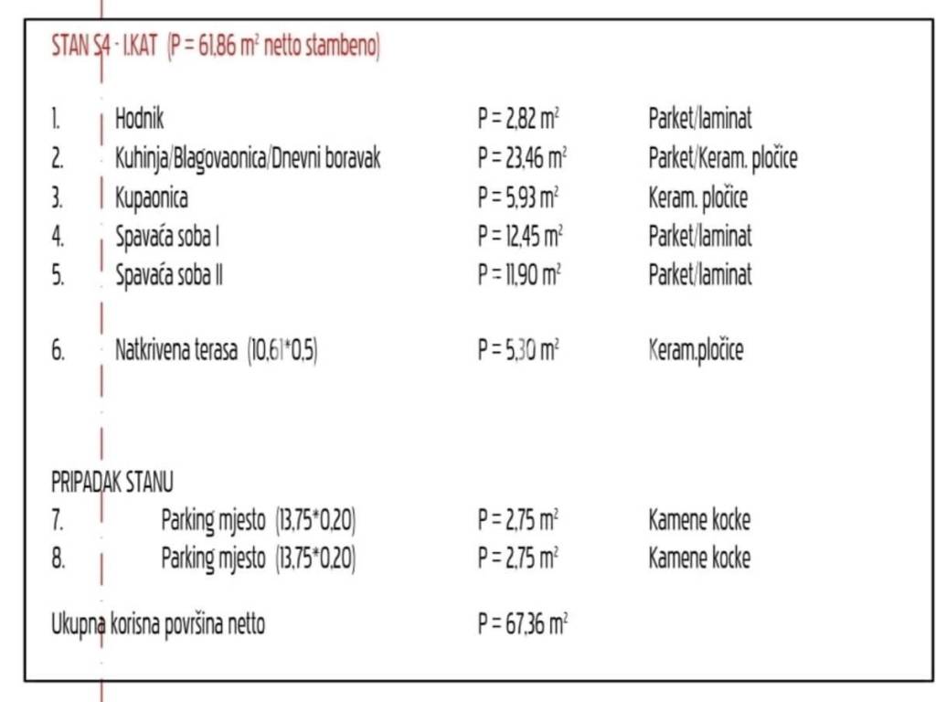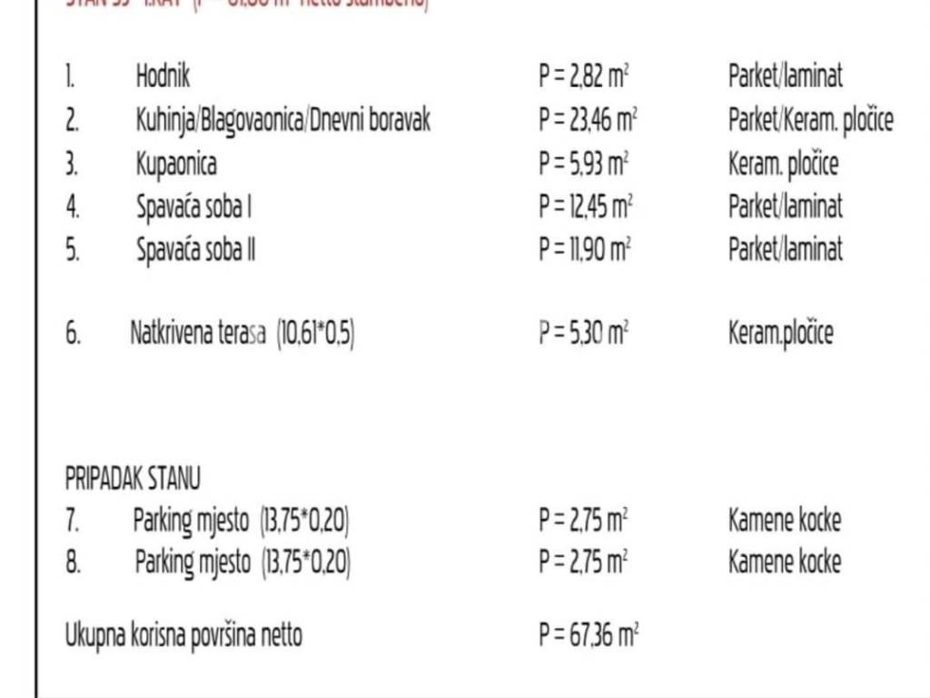 The apartment is located on the first floor and has 67.36 m². Its layout consists of an entrance hall, kitchen, dining area, bright living room with access to a spacious covered terrace, and two bedrooms. The apartment comes with two parking spaces. The beautiful Adriatic Sea is only 1,500 meters away, making this property a perfect choice for those who want to enjoy a peaceful seaside environment.