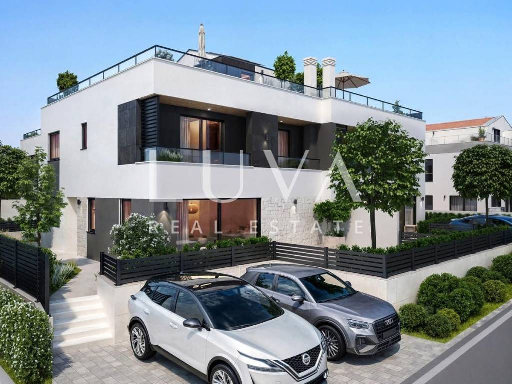The ground floor includes an open living area with kitchen and dining room, leading to a spacious terrace and pool, as well as one bedroom and bathroom. On the first floor, there are three bedrooms, each with its own bathroom, providing maximum comfort and privacy. The third floor, i.e. the attic, offers a multifunctional space that can be adapted to various needs – such as a home office, children’s playroom, or relaxation zone.