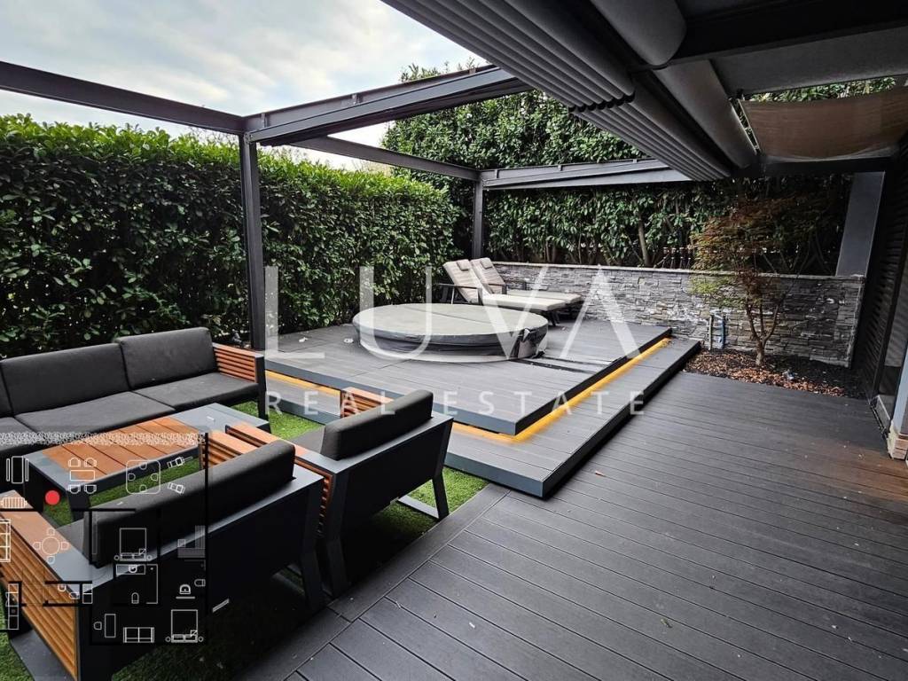 The apartment consists of a spacious living room with access to a large terrace, a kitchen with an island and dining area, two bathrooms and an additional guest toilet. The highlight of this property is a spacious 100 m² terrace, a real private oasis, completely covered with an electronic awning and protected by greenery that provides peace and privacy, equipped with a jacuzzi, sauna, table tennis and barbecue, ideal for relaxation and socializing throughout the year.