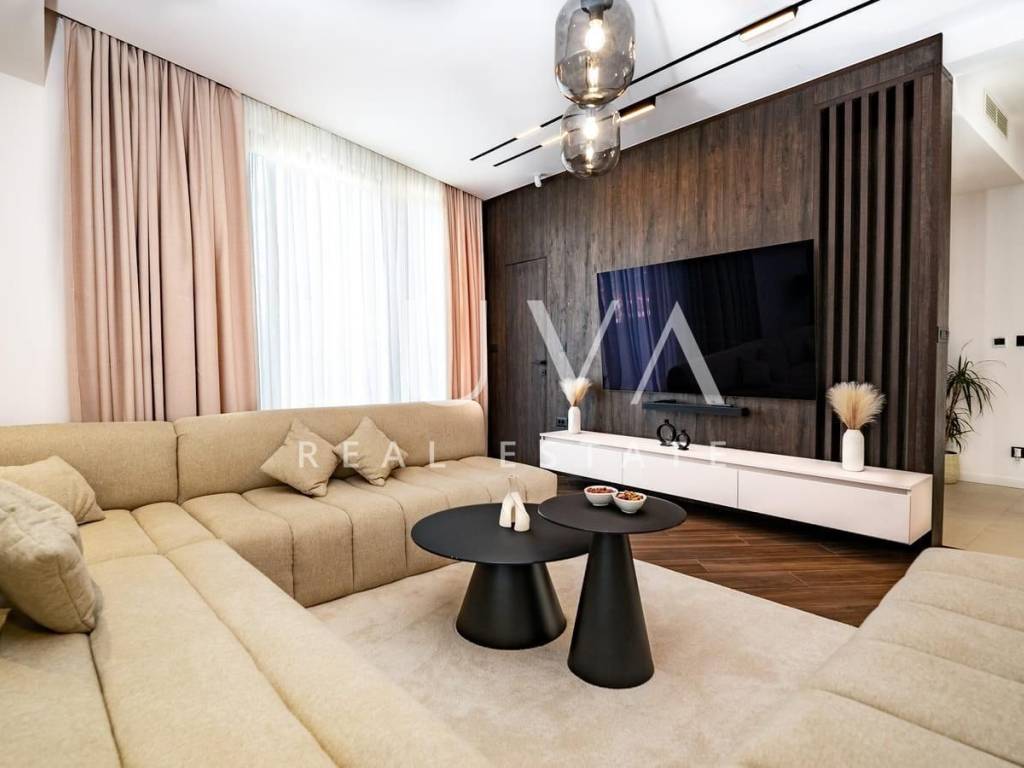The standout feature of this villa is the spacious rooftop terrace, which includes a swimming pool, sun deck, modern summer kitchen, fireplace, and an outdoor living area. The Jacuzzi provides a special experience, perfect for relaxing while enjoying breathtaking sunsets over the sea.