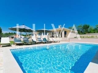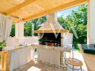 A luxury house with a pool for sale in a small village near Labin. The house has 215 m² on a 1470 m² plot. The ground floor features a spacious entrance hall leading to an open-plan living room and dining area. The living room is bright and airy, with large windows offering a stunning view of the garden. The house has 4 bedrooms, each with its own bathroom, and a guest WC. In the basement, there's a sauna and a gym area. The large property is beautifully landscaped with greenery, featuring an outdoor pool, a children's playground, and a covered terrace with a barbecue.