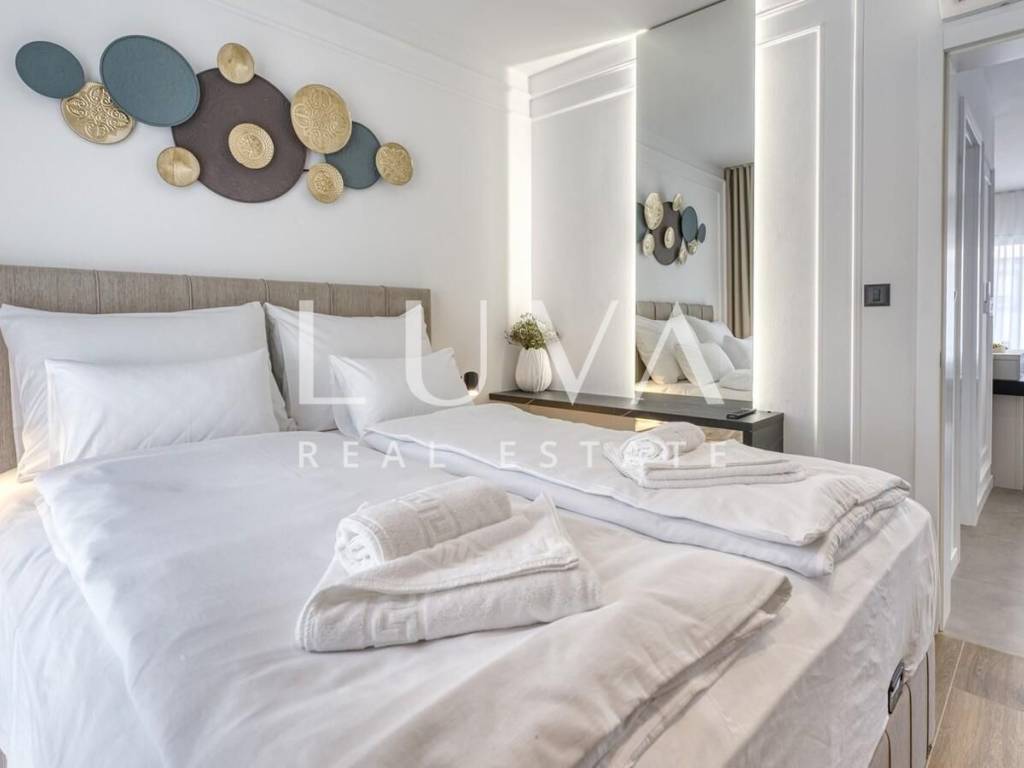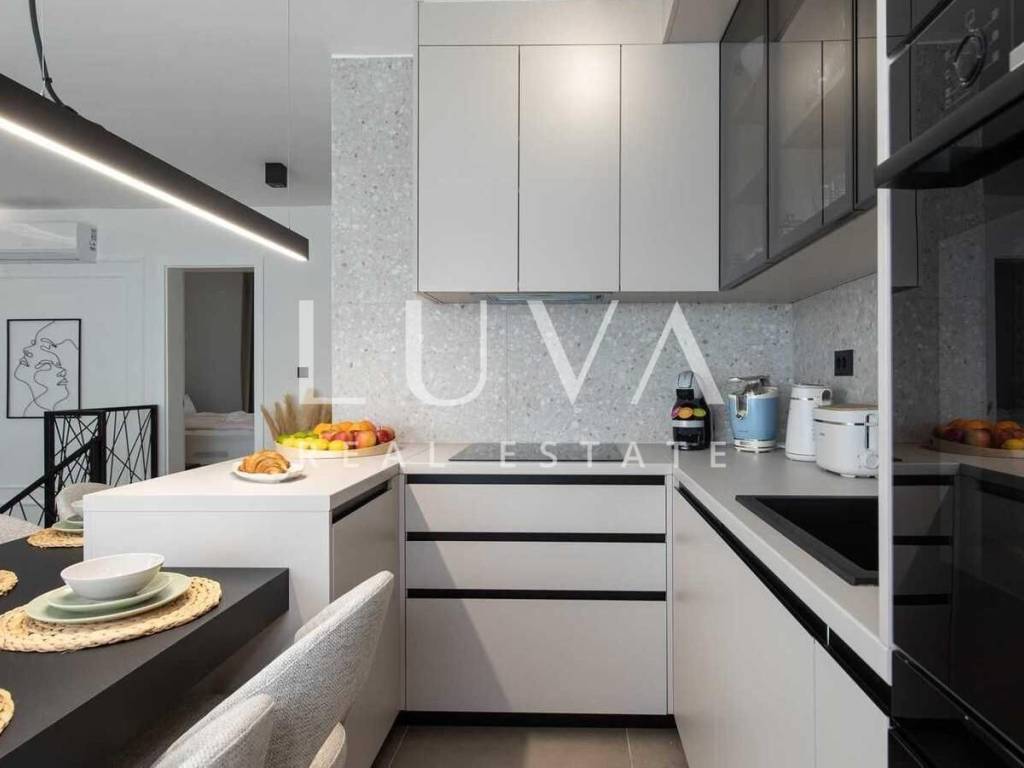A luxurious two-story apartment is for sale in a modern new building in the town of Krk on the island of Krk. This smaller building, with only four apartments, was constructed in 2022, and the entire property is fully enclosed to ensure privacy. The ground floor of the apartment features a wellness area with a sauna and Jacuzzi, with access to a private garden that includes an outdoor pool. The first floor hosts the living room and kitchen, which opens onto a loggia overlooking the street. The bedrooms are also located on the first floor, with access to a large open terrace at the back. The apartment is sold fully furnished and equipped, and it includes two parking spaces.