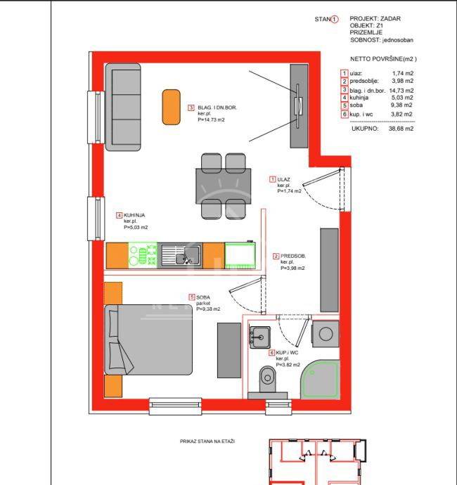 STAN S1 u prizemlju, jednosoban, sadrži: ulazni dio (pov. 1.74 m2), hodnik/predsoblje (pov. 3.98 m2), dnevni boravak s blagovaonicom i kuhinjom (pov. 14.73 m2 + 5.03 m2), spavaću sobu (pov. 9.38 m2) i kupaonicu (pov. 3.82 m2).