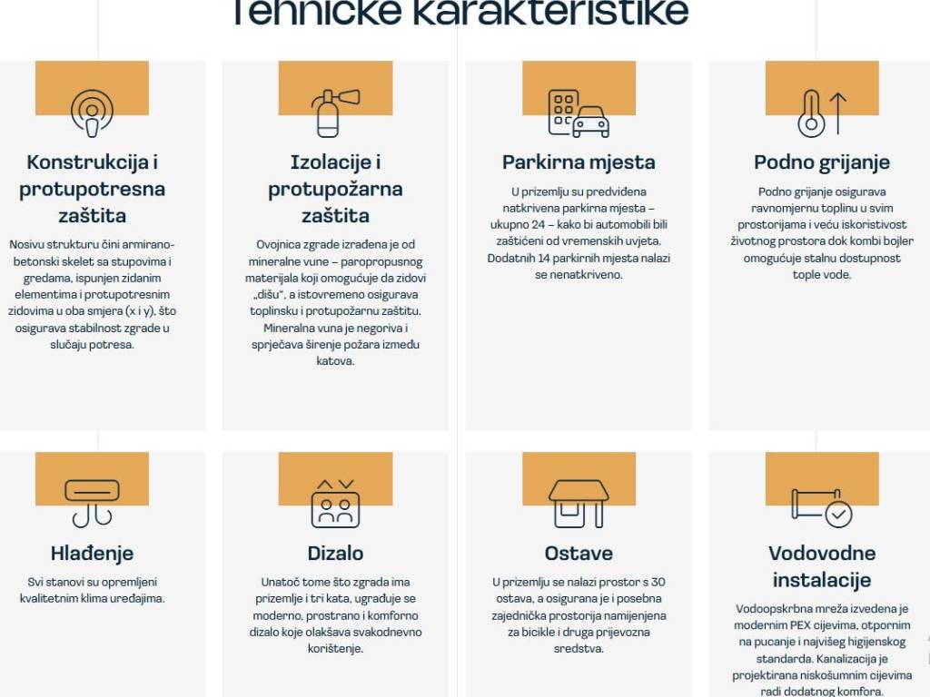Svi stanovi će biti opremljeni podnim grijanjem, hrastovim parketom, unutarnjom stolarijom s magnetskim bravama te dodatnim spremištem u prizemlju.
