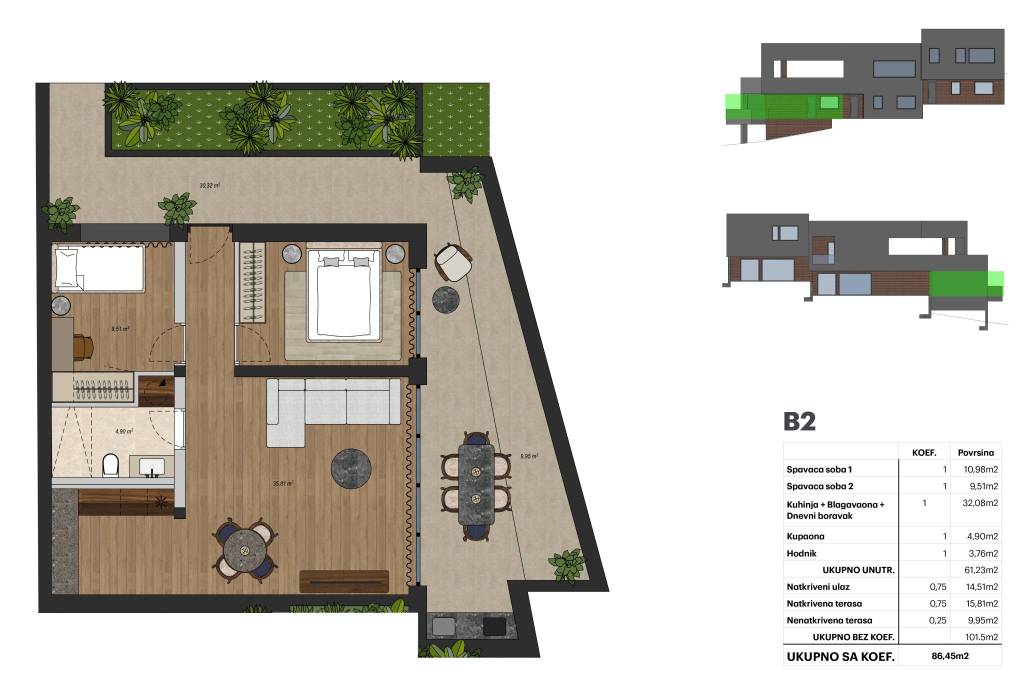 Maksimir, Barutanski jarak, NOVOGRADNJA, vrhunska lokacija okružena zelenilom i prirodom, a opet u neposrednoj blizini centra grada i parka Maksimir. Projekt luksuzne zgrade građene prema najvišim standardima s ukupno 4 stana. Useljenje ljeto 2026. godine.Stan B2 - trosoban stan u prizemlju zatvorene površine 61,23 m2, natkriveni ulaz 14,51 m2, natkrivena terasa 15,81 m2, nenatkrivena terasa 9,95 m2. Stan se sastoji od ulaznog prostora, dnevnog boravka, blagovaonice i kuhinje otvorenog tlocrta s izlazom na terasu, dvije spavaće sobe i kupaonice. Ukupno obračunski NKP 86,45 m2.Zgradu i stanove odlikuje najviši stupanj opreme i suvremena tehnologije u pogledu instalacija i upravljanja istima, dok energetska učinkovitost zadovoljava najviše standarde.Vrhunska keramika - Vives Ceramica (zid), Iris Ceramica 120 x 60 cm (pod), Mirage 80 x 80 cm (pod outdoor).Ulazna vrata- Aluminijska protuprovalna vrata Antracit s obje strane + Rukohvat 1800 mm (HLM). Sobna vrata- Filomuro vrata po mjeri RAL 9016. Vanjska stolarija - PVC + Aluminij s roletama na električno upravljanje (troslojno staklo).Sanitarije više klase - miješalica wc zidna podžbukna Zuchetti Pan Brushed Nickel, tuš zidni podžbukni set s kišnim tušem 250fi Zucchetti Pan Brushed Nickel, wc školjka globo ceramica (no rim , sporo spuštajuća daska , konzolna), tipkalo soft touch TECE, vodokotlić ugradbeni TECE profil.Parket Galeković četkani hrast 600 x 1800 x 15 mm višeslojni. Grijanje - podno plinsko. Hlađenje - Klima jedinice Mitsubishi (spavaća soba, dnevni boravak). Ulaz - kamera na prepoznavanje tablica i električno upravljanje vratima.Obavezna kupnja garažnog i vanjskog parkirnog mjesta.Prekrasna lokacija s puno privatnosti idealna za uživanje, mirno i kvalitetno življenje. Dobra prometna povezanost, blizina svih potrebnih sadržaja.Za sve ostale informacije stojimo na raspolaganju.
