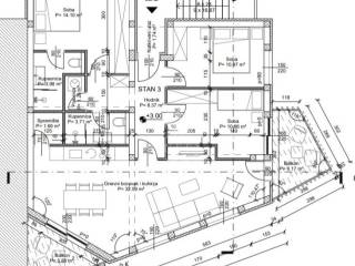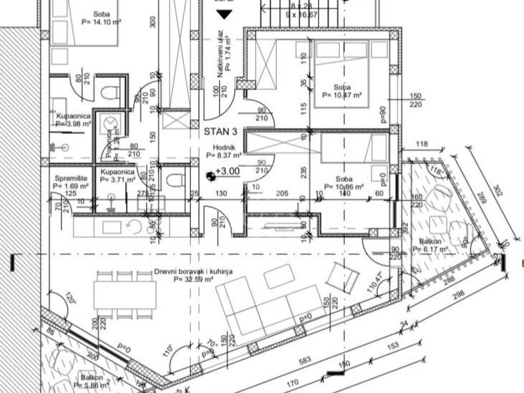 koji se sastoji od : spavaća soba 1) površine 14,10m2, spavaća soba 2) površine 10,47m2, spavaća soba 3) površine 10,86,2, kupaonice 1) površine 3,98m2,kupaonice 2) površine 3,71m2, hodnika površine 8,37m2, kuhinje spojene sa dnevnim boravkom površine 32,59m2, terasa površine 6,12m2 i balkon površine 5,86m2