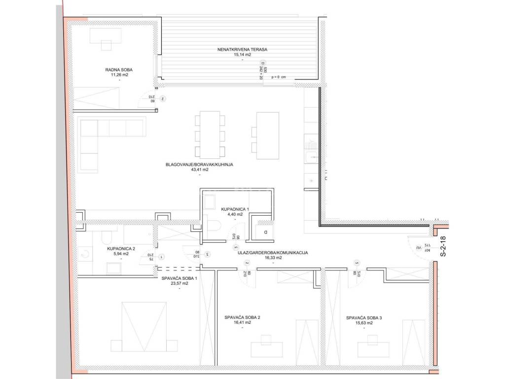 Stan S-2-18 smješten je upotkrovljui predstavlja luksuzan prostor za obitelji ili one koji traže prostran i funkcionalan dom s dodatnim vanjskim prostorom. Njegov pažljivo osmišljen raspored pruža savršen balans između privatnosti i otvorenog prostora, omogućujući maksimalnu udobnost i funkcionalnost.