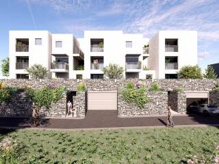 In a quiet part of Podstrana, just 500 meters from the beach, a contemporary residential building is under construction, featuring a total of 13 elegantly designed apartments. The building consists of three joined units with an underground level that includes garage parking spaces and storage rooms. The entire project is designed to offer high-quality living, comfort, and practicality at an exceptional micro-location above the main road, with excellent transport connections.