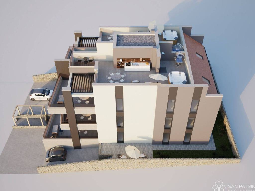 Nestled in the charming fishing village of Šimuni on Pag Island, this exclusive modern development consists of two elegant buildings with a total of 12 luxurious residential units. This intimate and rare location, surrounded by pine forests, creates a true oasis of peace and greenery on an otherwise rocky island.