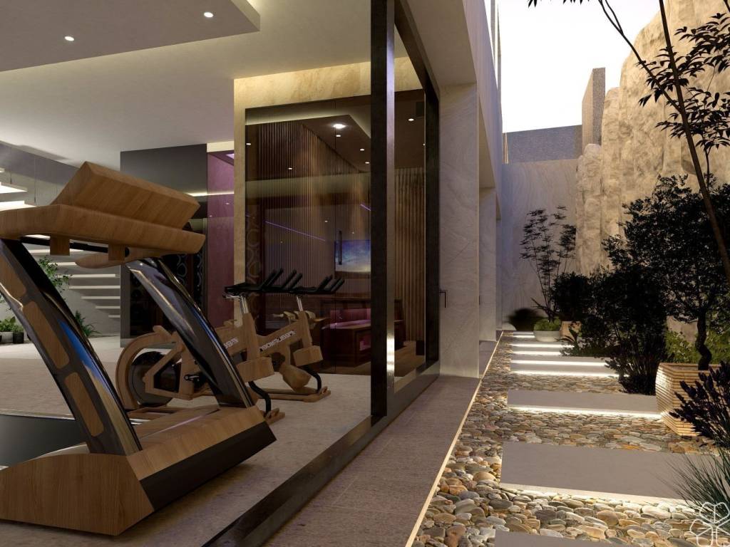 The basement is designed as a relaxation and entertainment area featuring a wellness zone, sauna, fitness room, gaming room which can also serve as an extra bedroom, private cinema, and an attractive lounge area carved into the rock.