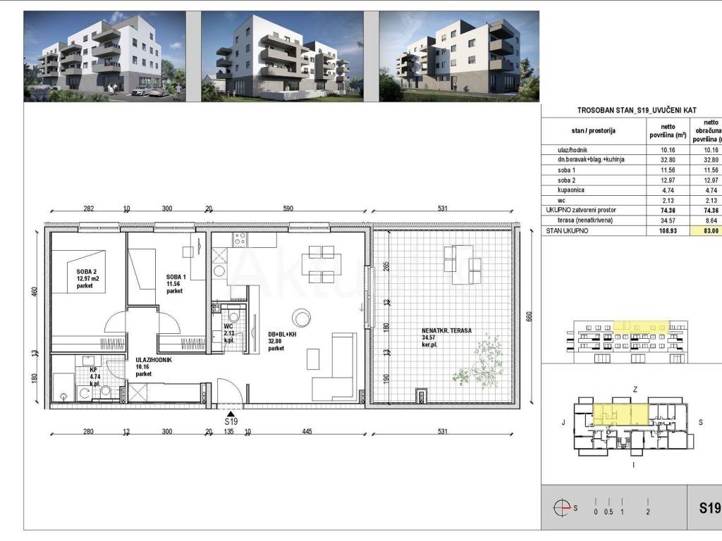 Stan oznake S19 nalazi se na zadnjem katu zgrade, ukupne površine 83 m2 a sastoji se od ulaznog prostora/hodnika, kuhinje, blagovaonice i dnevnog boravka, 2 sobe, kupaonice, wc-a i terase.