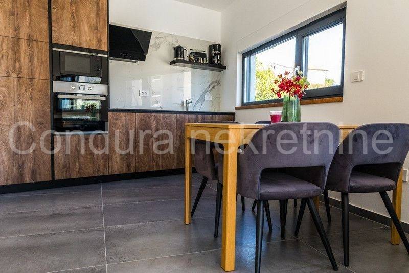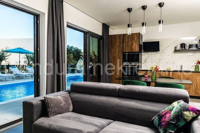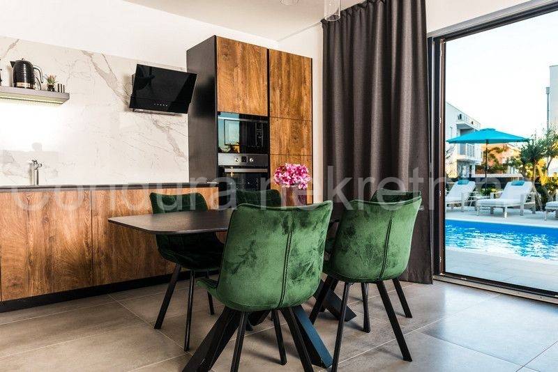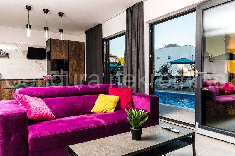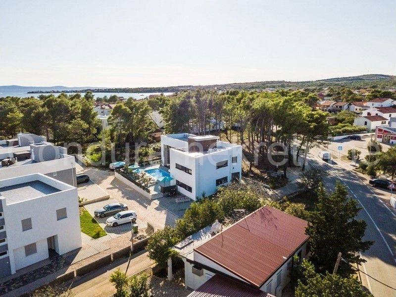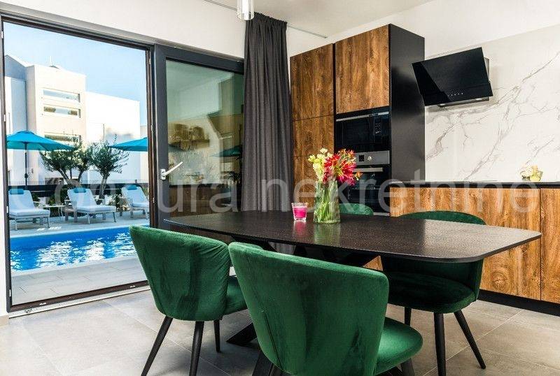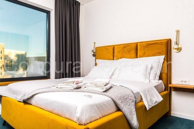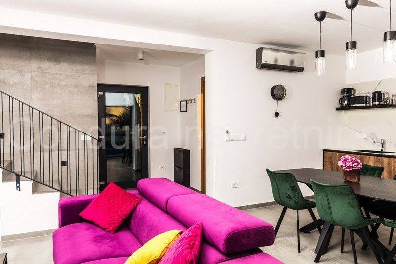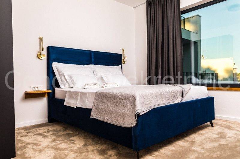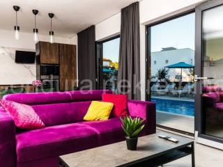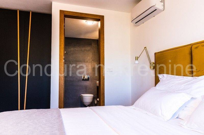 All apartments on the ground floor lead out through large glass walls to a beautifully landscaped yard with a swimming pool and sun deck. The house is fully furnished and equipped with all appliances necessary for a pleasant stay. In an excellent location, only 500 m from the nearest beach and the very center of the island of Vir.