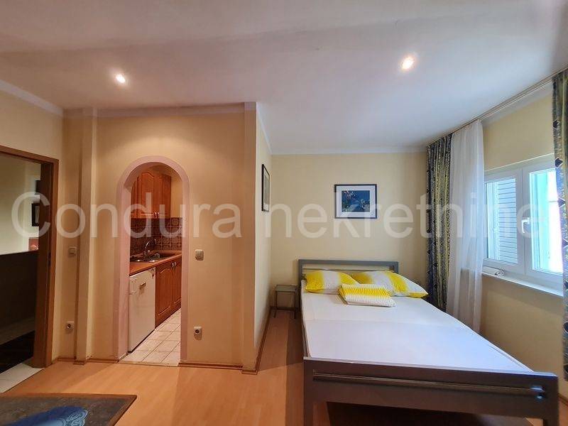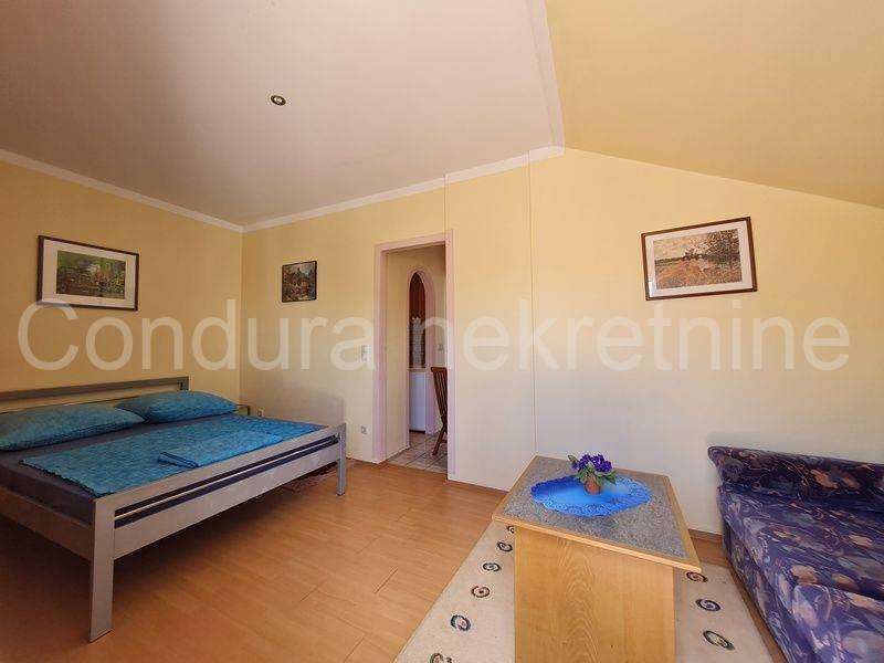On the ground floor there is a garage and one apartment consisting of a hallway, two bedrooms, living room, dining room, kitchen and bathroom. On the upper floor there is a hallway, two terraces and two studio apartments with a shared bathroom in the hallway.