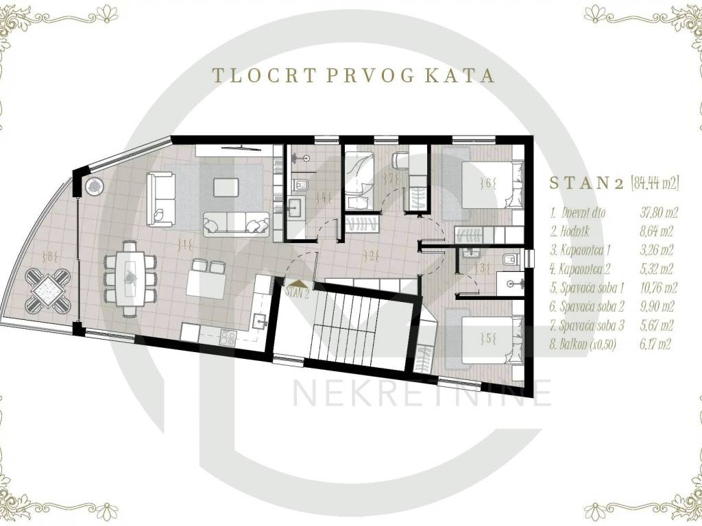 dnevnog boravka sa blagovaonicom površine 37,80 m2