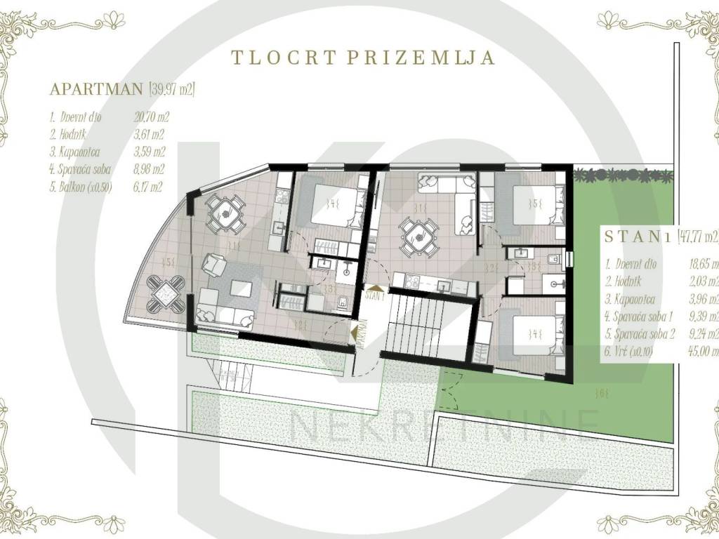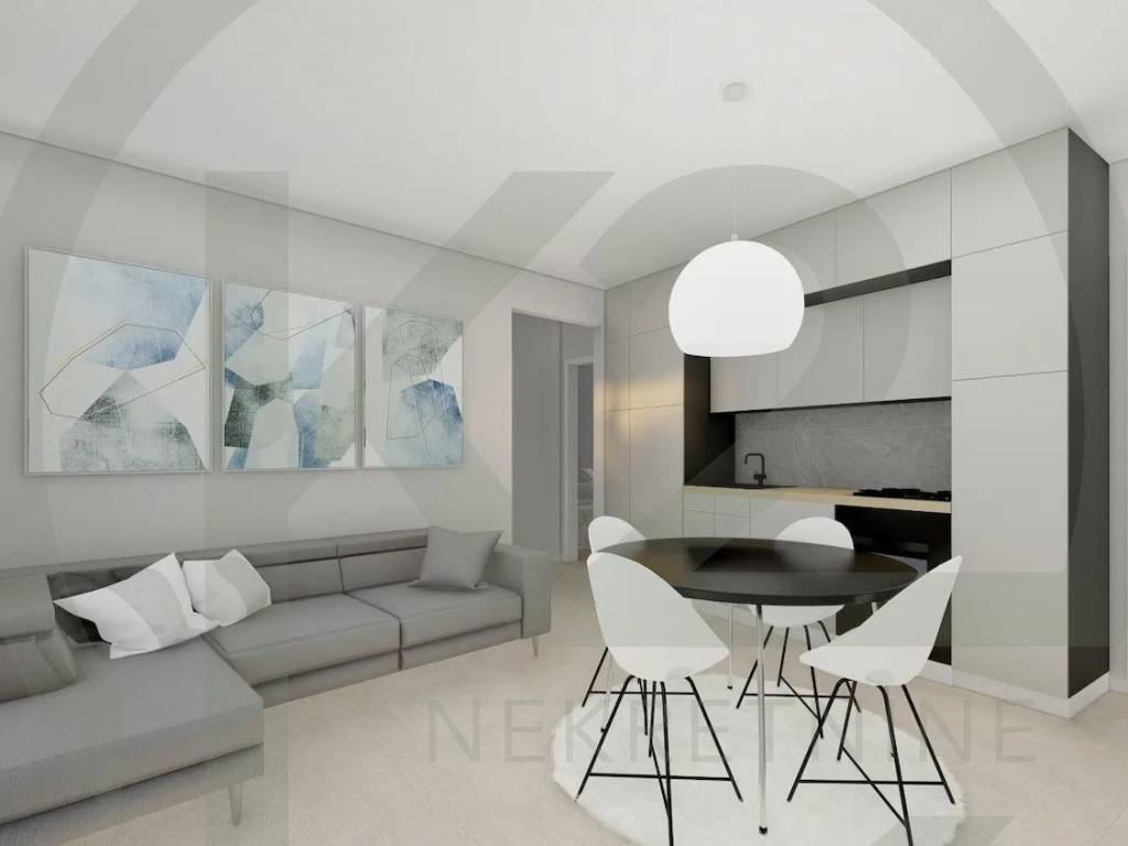 Svaki stan opremljen je keramikom velikog formata,kupaonskom opremom 1.klase,komarnicima, PVC stolarijom sa troslojnim staklom i klimom.Armiranobetonska konstrukcija, zidovi betonski blok i izolacija EPS 8 cm.