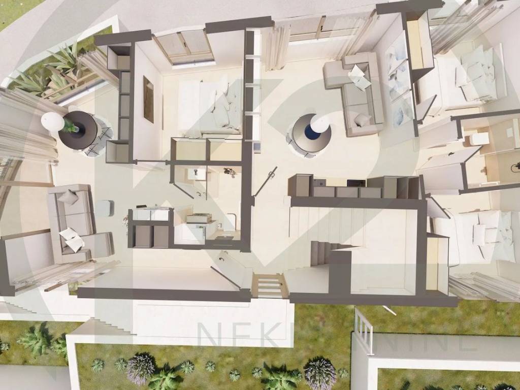 Projekt je zamišljen kaonepravilni pravokutnik s ravnim, prohodnim krovom i osmišljenza sve koji traže spoj kvalitetne gradnje, funkcionalnog rasporeda i mediteranskog načina života s panoramskim pogledom na more i grad.