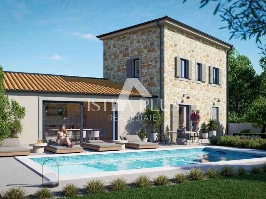K320Mediterranean villa under construction near VišnjanA beautiful Mediterranean-style family house, located in a quiet and green area around Višnjan.Construction began in 02/2026, and it was designed with an emphasis on quality construction, functionality of the space and Mediterranean charm.The ground floor consists of: entrance hall,a spacious living room with access to the terrace,an open-concept kitchen with dining area,a bathroom, a storage room / technical room.On the first floor there are two comfortable bedrooms and one shared bathroom.In the landscaped courtyard of approximately 450 m², a 32 m² swimming pool, a sunbathing area and a covered terrace are planned - an ideal place to relax and enjoy warm Istrian days. The heating is electric underfloor throughout the house and the air conditioners are inverter.The house is built of quality materials, with modern insulation and large glass surfaces that provide plenty of natural light.All amenities such as shops, restaurants and schools are located in the immediate vicinity, while the sea and famous tourist destinations of the western coast of Istria are only a 15-minute drive away.This villa represents the perfect blend of traditional Istrian architecture and modern comfort, ideal for family life or as an investment for tourist rental.