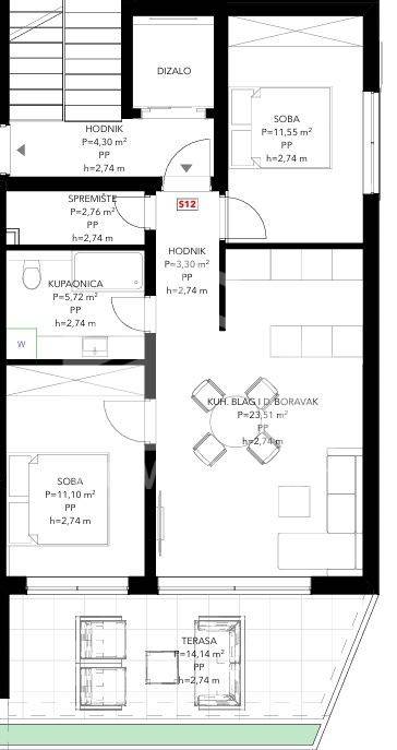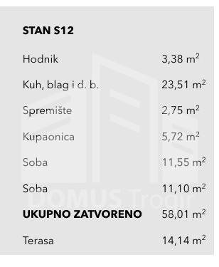 Apartment S12 consists of a hallway of 3.38 m, a kitchen, dining room and living room of 23.51 m, a storage room of 2.75 m, a bathroom of 5.72 m and two bedrooms - one of 11.55 m and the other of 11.10 m. The total closed area of the apartment is 58.01 m, while the terrace is 14.14 m. The apartment has one garage parking space.