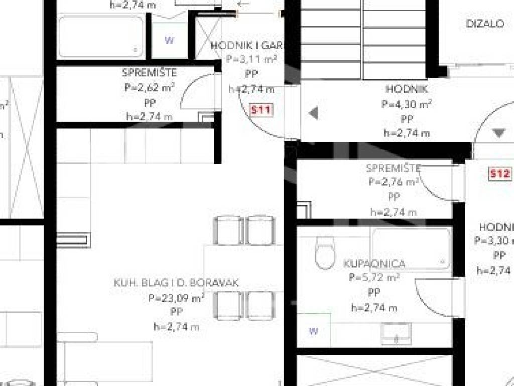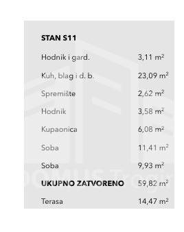 Apartment S11 consists of a hallway and cloakroom of 3.11 m, a kitchen, dining room and living room of 23.09 m, a storage room of 2.62 m, an additional hallway of 3.58 m, a bathroom of 6.08 m and two bedrooms - one of 11.41 m and the other of 9.93 m. The total closed area of the apartment is 59.82 m, while the terrace is 14.47 m. The apartment has one garage parking space.
