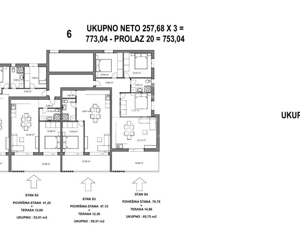 Na zemljištu se može graditi objekt od tri etaže s ukupno 12 stanova, tlocrte idejnog projekta možete pronaći u galeriji.