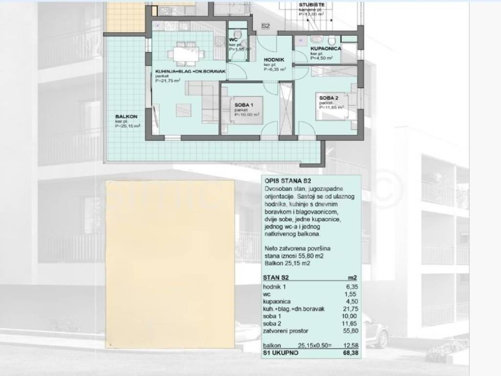 We are mediating the sale of an excellent new building that should be completed in early spring 2026, and which is located in a quiet location in the western part of the city. This apartment is placed on the 1st floor and has a sales area of 68.38m2. It consists of two bedrooms, a bathroom, an additional toilet, a hallway and a spacious living room with a kitchen. From this part of the apartment there is an exit to a beautiful balcony with a wonderful view of the sea and the city. The apartment itself is very functionally designed, while the entire building is distinguished by the quality of the selection of first-class parquet floors, modern and impressive ceramics in combination with carefully selected sanitary ware, top-quality security doors... Within a ten-minute walk there are facilities for a peaceful family life (kindergarten, school, shop), while the famous Makarska beaches are approximately twenty minutes walk away. We emphasize that the investor is a legal entity and does not pay 3% real estate tax. Ownership is in order.