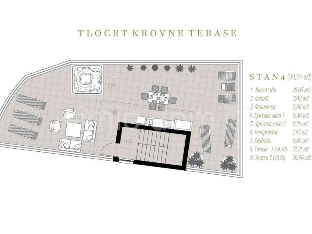 We are mediating the sale of a very high-quality and spacious apartment in a quiet location in Podstrana. The apartment has a total area of 79.94m2 and is placed on the second floor of a small building with only 5 units, thus guaranteeing peace and privacy. The apartment consists of two bedrooms, a bathroom, a large living room with a kitchen and a dining room, and the apartment also has an impressive roof terrace with an incredible view of the sea, islands and the entire surrounding area. Construction will begin in early spring 2026 and is expected to be completed in early summer 2027. The construction itself is excellently planned and the building will be of top quality: tested air conditioning, insulation, first-class bathroom equipment... We would like to emphasize that the price of the apartment also includes a garage parking space and a small storage room, and since the investor is a legal entity, there is no obligation to pay 3% real estate tax. Ownership is in order.