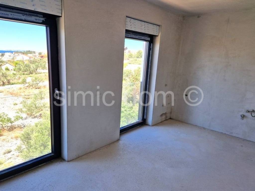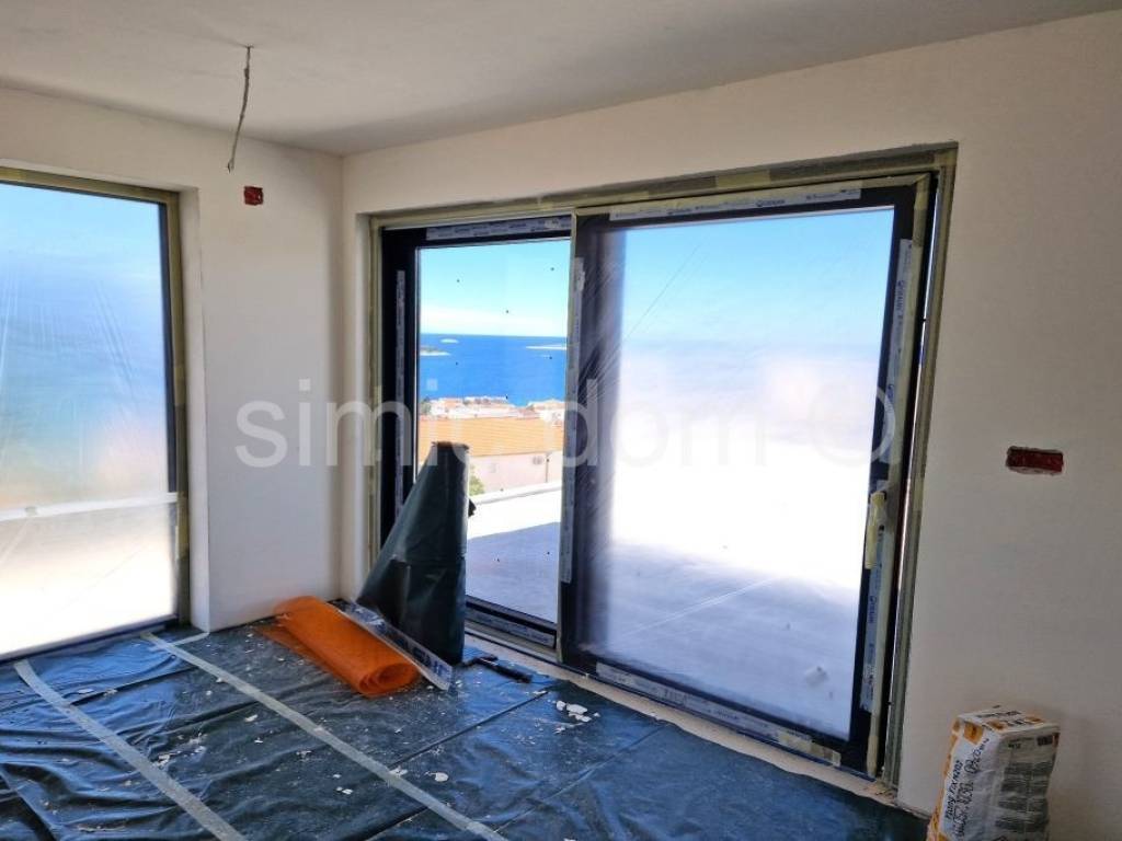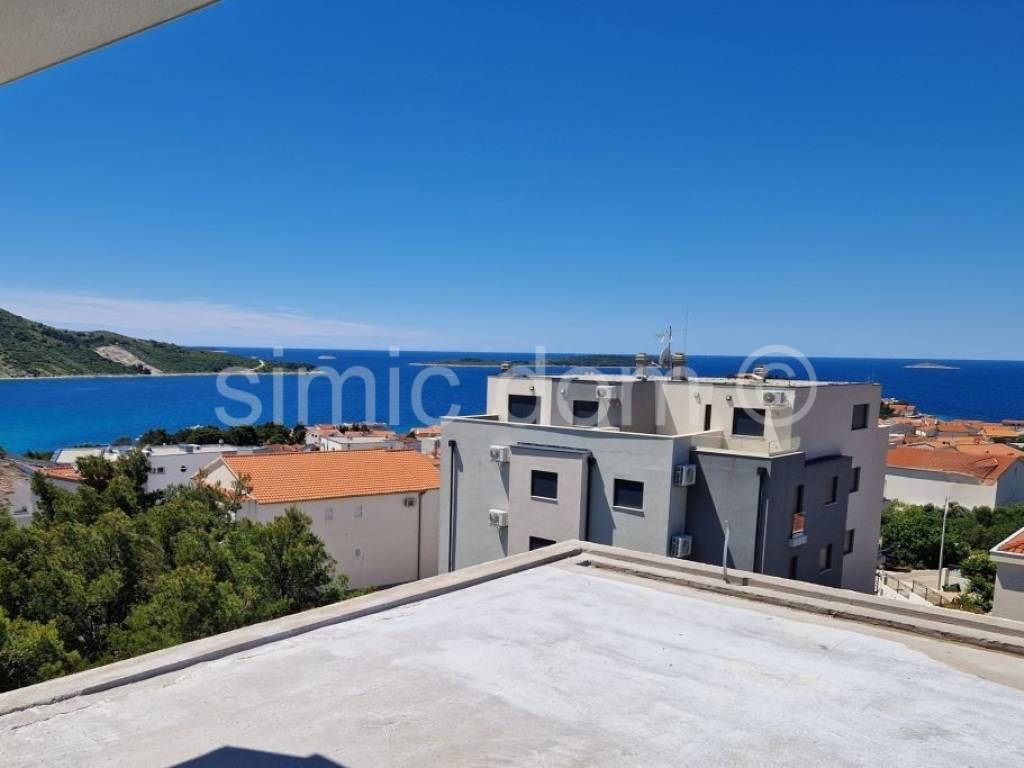 We are mediating the sale of an apartment located in a modern new building in an extremely quiet street in Primosten, but only 10 minutes on foot from all amenities and the beach, i.e. 300 meters as the crow flies from the crystal-clear Adriatic Sea and 900 meters on foot from the famous pebble beach in Primosten. The building consists of 5 modern apartments. The penthouse apartment marked S5 is two-story and is placed on the second floor. It has a total net usable area of 92 m2 with all accessories. The interior area of the apartment is 61.79 m2 and has over 70 m2 of floor area of terrace with a superb sea view. On the lower floor there are two bedrooms, one of which has a private bathroom, another bathroom and access to a covered terrace. Internal stairs lead to the upper floor, where there is a spacious kitchen with dining room and living room in one open space. This floor is surrounded by terraces on three sides, totalling 66.03 m2, providing plenty of light and opportunities for outdoor enjoyment, some of which are covered. This new building is equipped with an external polystyrene facade, PVC joinery with electrically operated ALU shutters, underfloor heating in the bathrooms, inverter air conditioners for heating and cooling, security entrance doors, top-quality ceramics. This unique layout creates a comfortable and practical living space for enjoying the beautiful surroundings of Primosten. The apartment also has one parking space included in the price. Expected completion is summer 2025.