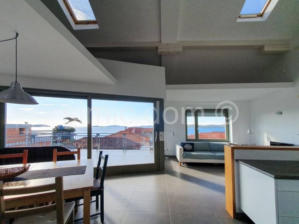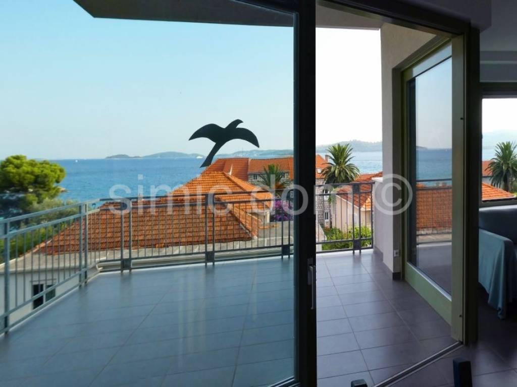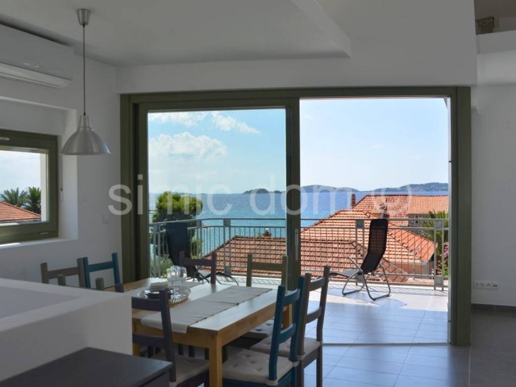 We are mediating the sale of a beautiful, beautifully furnished apartment with an irresistible view of the sea and Korcula. The apartment has a surface area of 129 m2 and is spread over the first and second floors of a building with only 4 apartments. On the lower level there is a small terrace at the entrance, two bedrooms, a bathroom and a storage room. On the upper level there is an additional bathroom and a more than impressive living room with a raised ceiling, a kitchen and a dining room. It is from this part that you can exit to a spacious, excellently decorated terrace that offers a panoramic view of the entire area. The entire property is excellently furnished and equipped with carefully selected furniture and household appliances, and the overall impression of the property is truly special: full of light, maximally used and functional space ideal for a family, but also for a tourist rental business. The location is in the very center of Orebic, and the distance from the beach is only 160m. Two parking spaces are also included in the price. Ownership is neat.