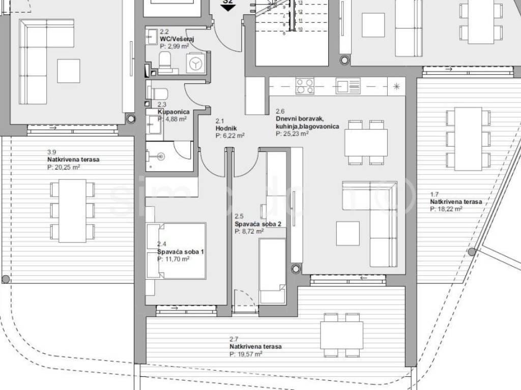 Apartments in a new building in a prime location in Vodice, just a few steps from a beautiful pebble beach, are for sale. This is a new building with a total of 8 apartments. The building is being built by a reputable company with extensive experience in building extremely high-quality buildings. The apartments will be excellently equipped: underfloor heating in the bathrooms, living room and hallway, mosquito nets and electric roller shutters throughout the apartment, and air conditioning in all rooms. The bathrooms will be equipped with: Hansgrohe faucets and shower, wall-mounted toilet, Grohe built-in cistern, sink, shower tray and Nord cabin, and an 80l water heater. The joinery is made of high-quality PVC profiles for good thermal and sound insulation, floors in the apartment Marazzi ceramics, etc. Apartments S2 and S5 have the same layout and identical internal area of 59.70 m2 and also have terraces of 21.47 m2 (S2) and 19.16 m2 (S5). They consist of a hallway, two bathrooms, two bedrooms and a kitchen with a living room and dining room that has access to a beautiful covered terrace. Apartment S2 is placed on the ground floor of the building, while apartment S5 is on the first floor. This property is extremely good for both your own property and for future tourist rental. Expected move-in is summer 2026.