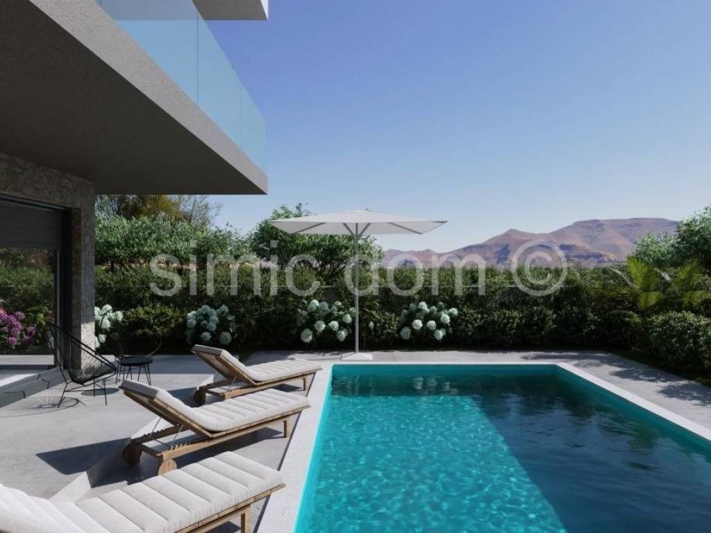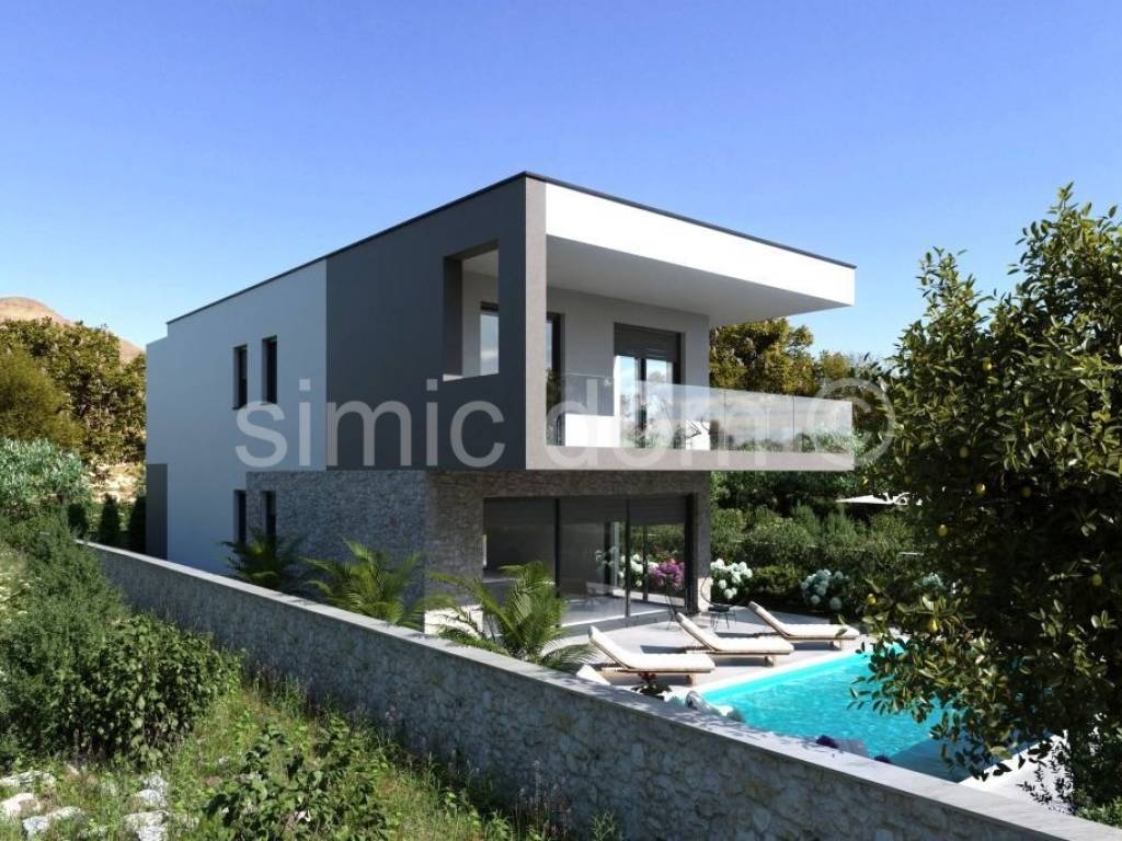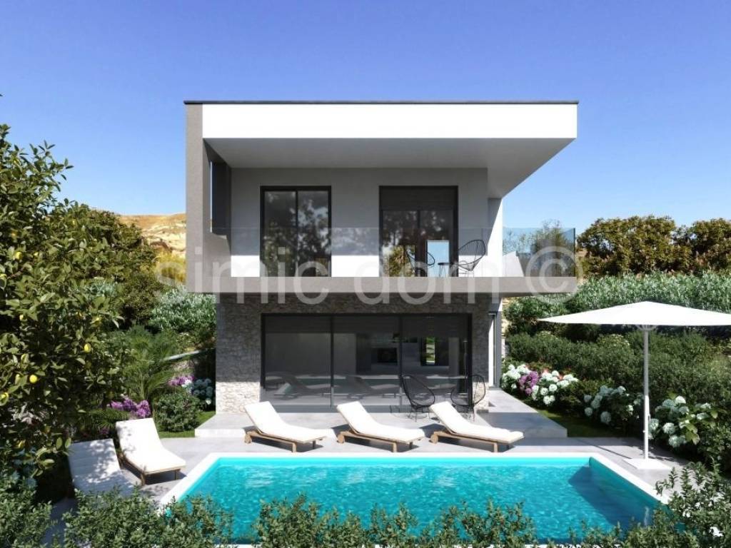 We mediate in the sale of a villa located in an extremely attractive location next to the beach in Murter. The villa is located in a quiet location, yet within walking distance of all amenities, cafes and restaurants, as well as the center of Murter. The villa is being built by a construction entrepreneur with extensive experience in building extremely high-quality properties. The villa has a total net usable area of 188m2, or 216m2 of total floor area, and extends over 2 floors. On the ground floor there is a large open-concept living room with a kitchen and dining room, a laundry room, a storage room, a bathroom and a bedroom. The living area opens onto a terrace with a swimming pool, and there is also a sundeck and a garden surrounding the villa. The first floor consists of 3 bedrooms with private bathrooms, each with a built-in wardrobe. There is also a large covered terrace with a beautiful sea view and a covered balcony. Parking for 2 cars is provided in the garden. The villa will be superbly equipped, and the owner intends to furnish it with top-quality furniture. The villa will be equipped with top-quality aluminum joinery with mosquito nets, a heat pump, class 10 floor tiles, video surveillance, an alarm system, etc. The expected completion date is spring 2026.
