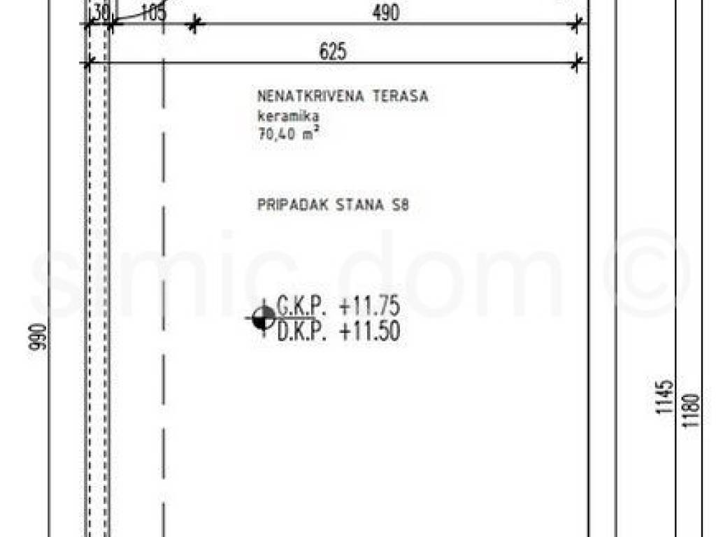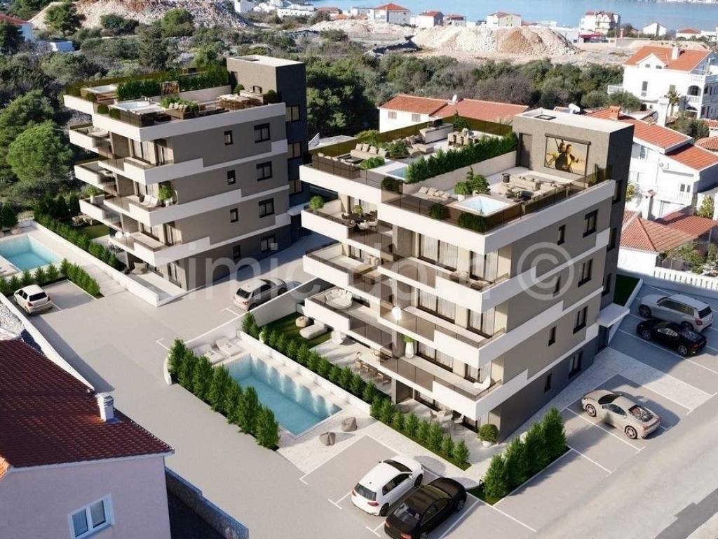 For sale is an apartment in new construction on the south side of the island of Ciovo, only 10 minutes' walk from the beach. The apartment is designated as S8 and is located on the third floor of a building with an elevator. It has a total internal area of 55.46m2, a balcony of 14.62m2 and a roof terrace of 70m2 floor area. From the roof terrace there is a spectacular panoramic view of the sea and the entire Okrug Gornji. The total net area of the apartment is 80.37m2. It consists of two bedrooms, two bathrooms and a kitchen with a living room and a dining room, which leads to a spacious balcony. The apartment includes a private parking spot. The building has a 28m2 swimming pool that can be used by all owners. The building will be of high quality, with 10 cm thermal insulation. Each apartment will have underfloor heating and air conditioning. Construction began in February 2024, and occupancy is expected in May 2025.
