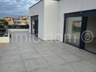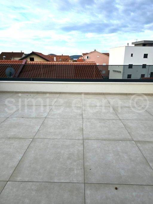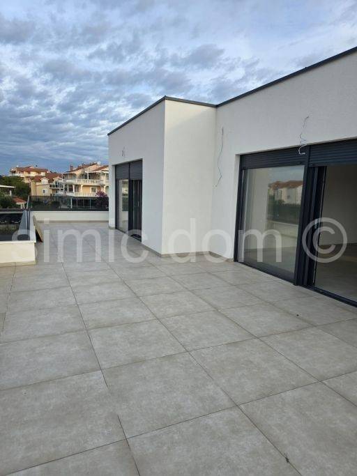For sale is a luxurious penthouse apartment located in a smaller residential building with 4 comfortable apartments with garages. The building is located only 270m from a beautiful pebble beach in Srima, and the center of neighboring Vodice is only 1.5km away. The apartment is located on the second floor and has a net usable area of 144.49m2, i.e. 106.69m2 of internal space, 110.70m2 of uncovered terrace and 17.51m2 of garage. The apartment consists of three bedrooms, two bathrooms, an entrance hall and a spacious kitchen with dining room and living room with access to the terrace. All apartments in the building will be equipped with high-quality ceramics, windows and doors with electric blinds and mosquito nets, burglar-proof entrance doors, underfloor heating in the bathrooms. Furthermore, every room and living room will have air conditioning and TV connection, as well as modern sanitary facilities. The planned move-in date is mid-summer 2024.