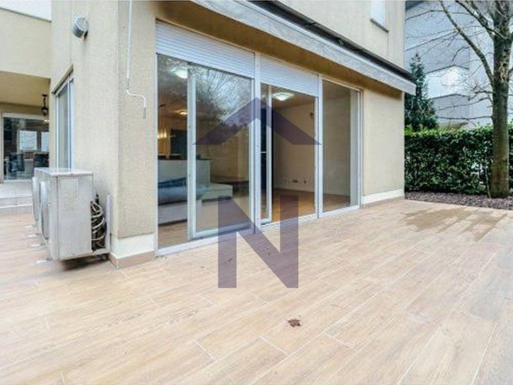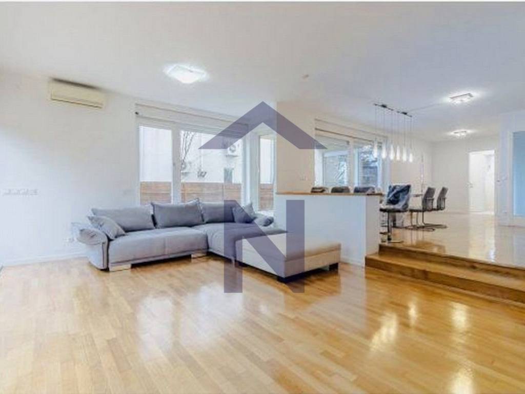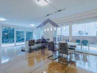 Podzemna etaža 100 m2 sastoji se odgaraže za četiri automobila,prostorijes kuhinjom ivešeraja s toaletom.Prizemlje se sastoji odvelikog dnevnog boravka povezanog s prostorom za blagovanje kao open space prostor,kuhinje,toaleta s predsobljem,loggie ivelike terase.Prvi kat se sastoji odhodnika,dvije spavaće sobe,velike spavaće sobe s garderobnom sobom i kupaonicom ikupaonice s toaletom.Drugi kat se sastoji oddrugog dnevnog boravka s kuhinjom,spavaće sobe,kupaonice s toaletom iterase.Kući prida prekrasan privatni vrt u stražnjem dijelu parcele s roštiljem, garaža u koju stanu 4 automobila + parkirna mjesta ispred.