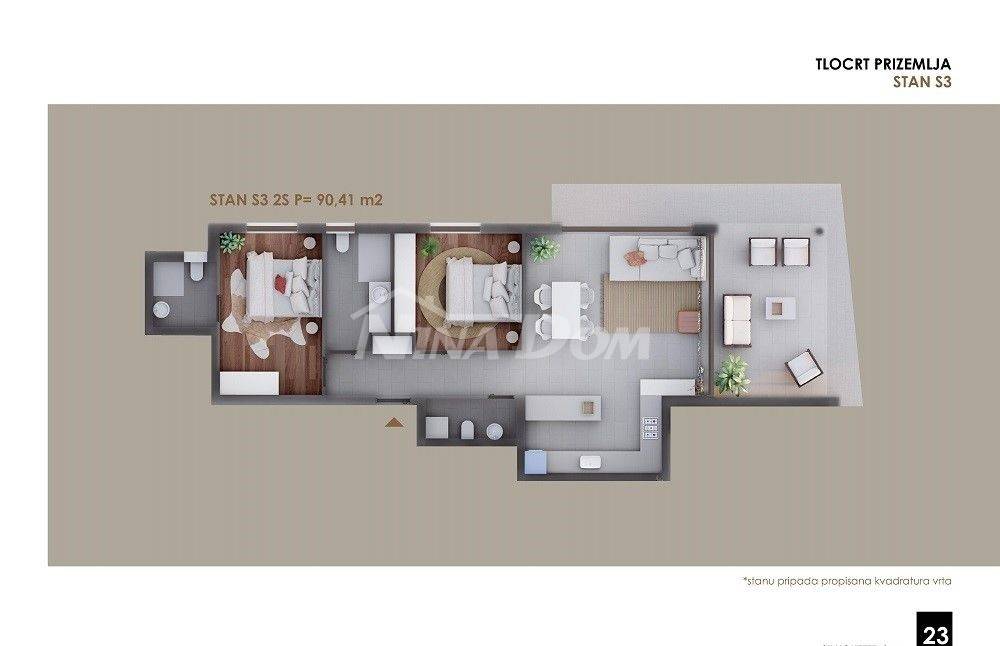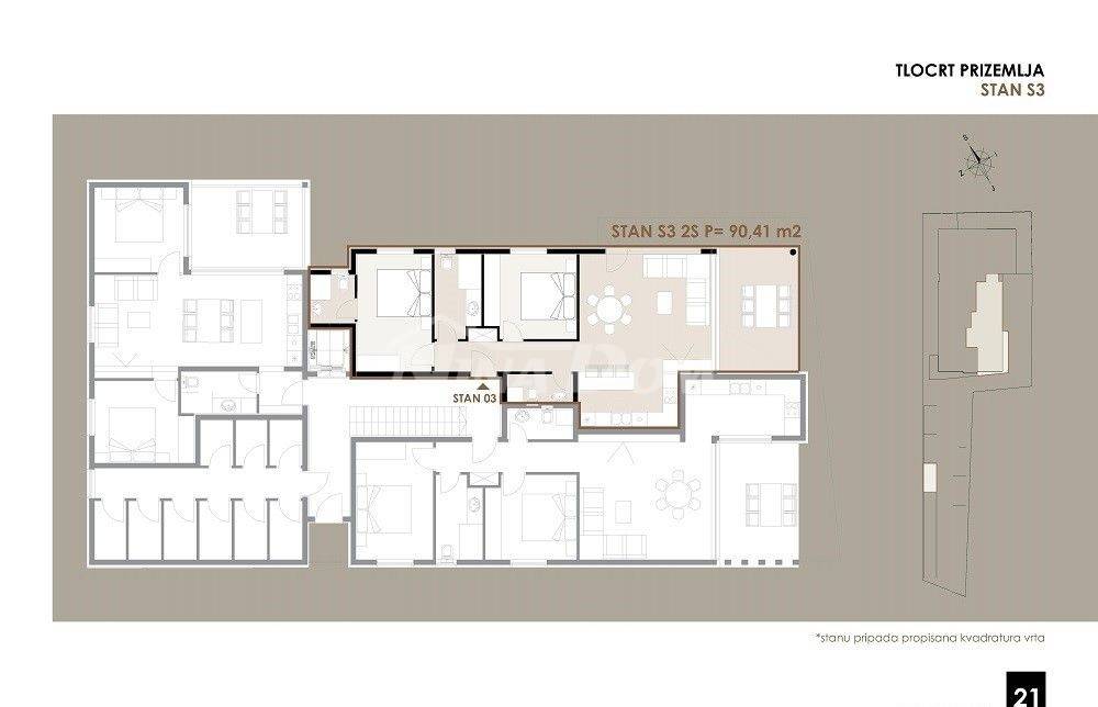 Apartman S3 smješten je u prizemlju i sastoji se od hodnika,dvije kupaone, dvije spavaće sobe, kuhinje s dnevnim boravkom, wc, natkrivenom terasom, ostava (spremište br,3) 2.20 m2.