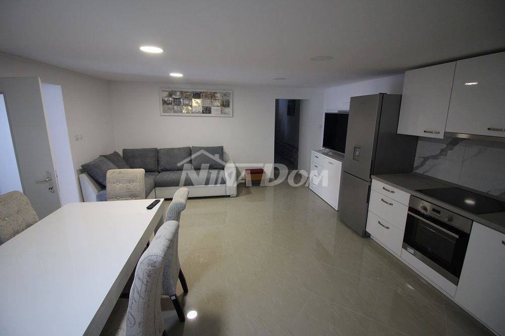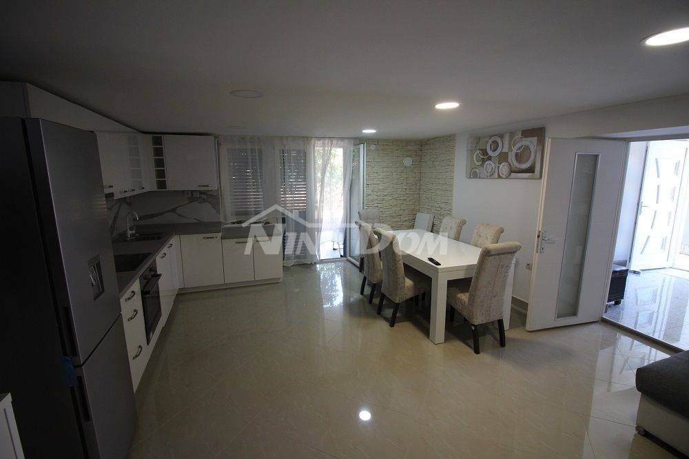 Prizemlje: kuhinja s dnevnim boravkom i blagovaonicom, dodatnom prostorijom, kupaonica. Garaža.