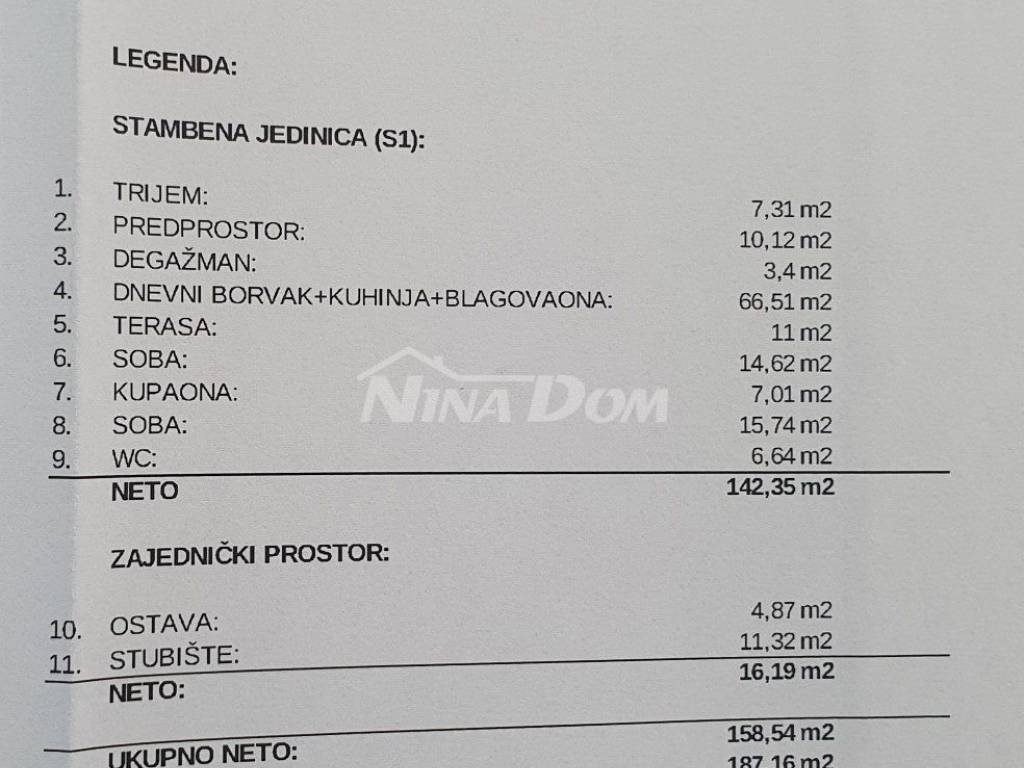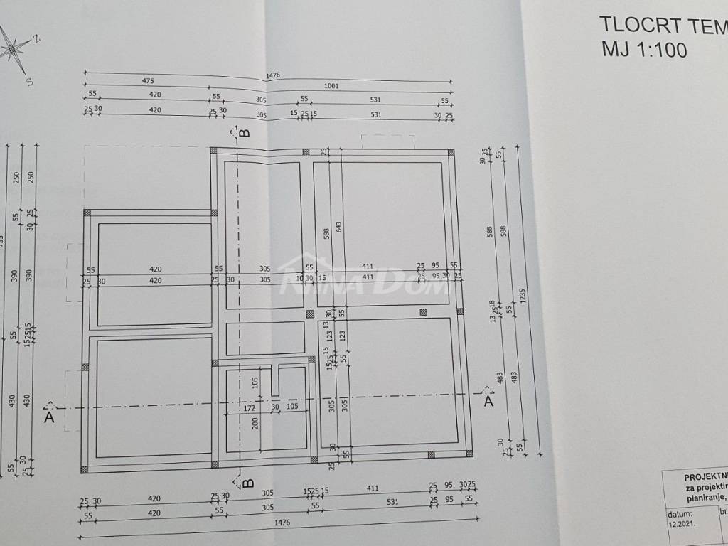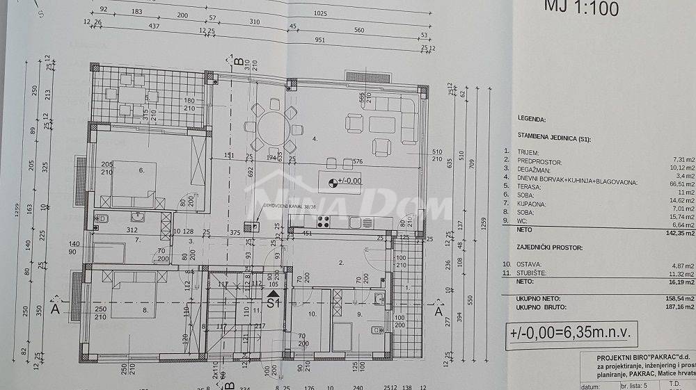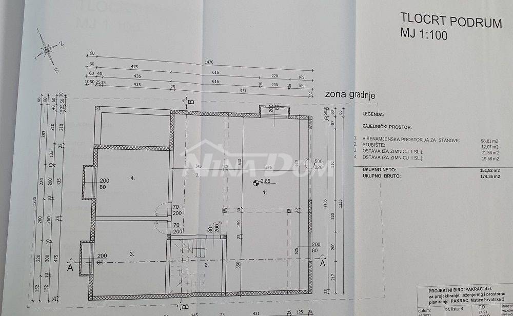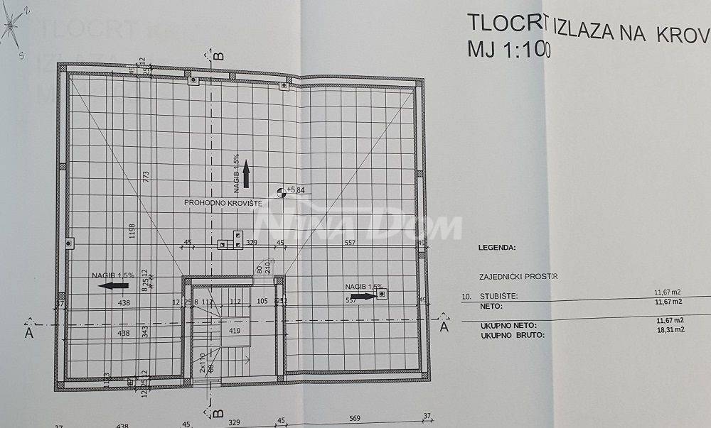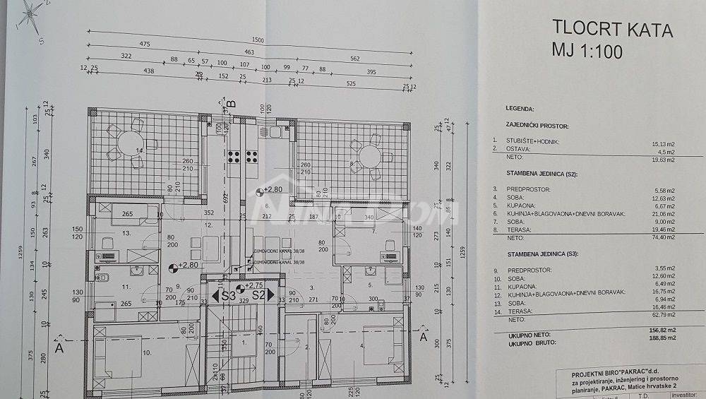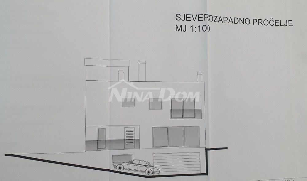 Projektiran je objekt s podrumom i garažom, prizemlje: veliki veliki stan, kat: dva apartmana, krovna terasa.