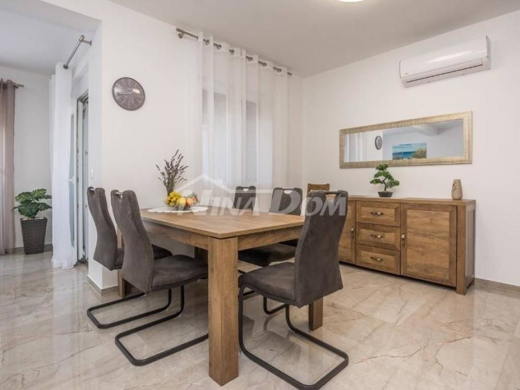 Kat: apartman s tri spavaće sobe, tri kupaonice, wc, kuhinja s dnevnim boravkom i blagovaona, terasa s pogledom na more.