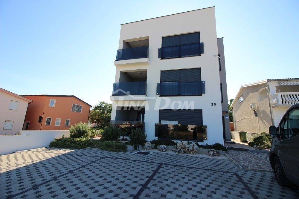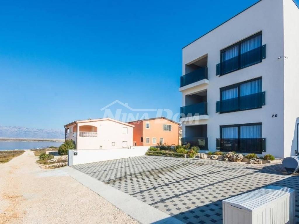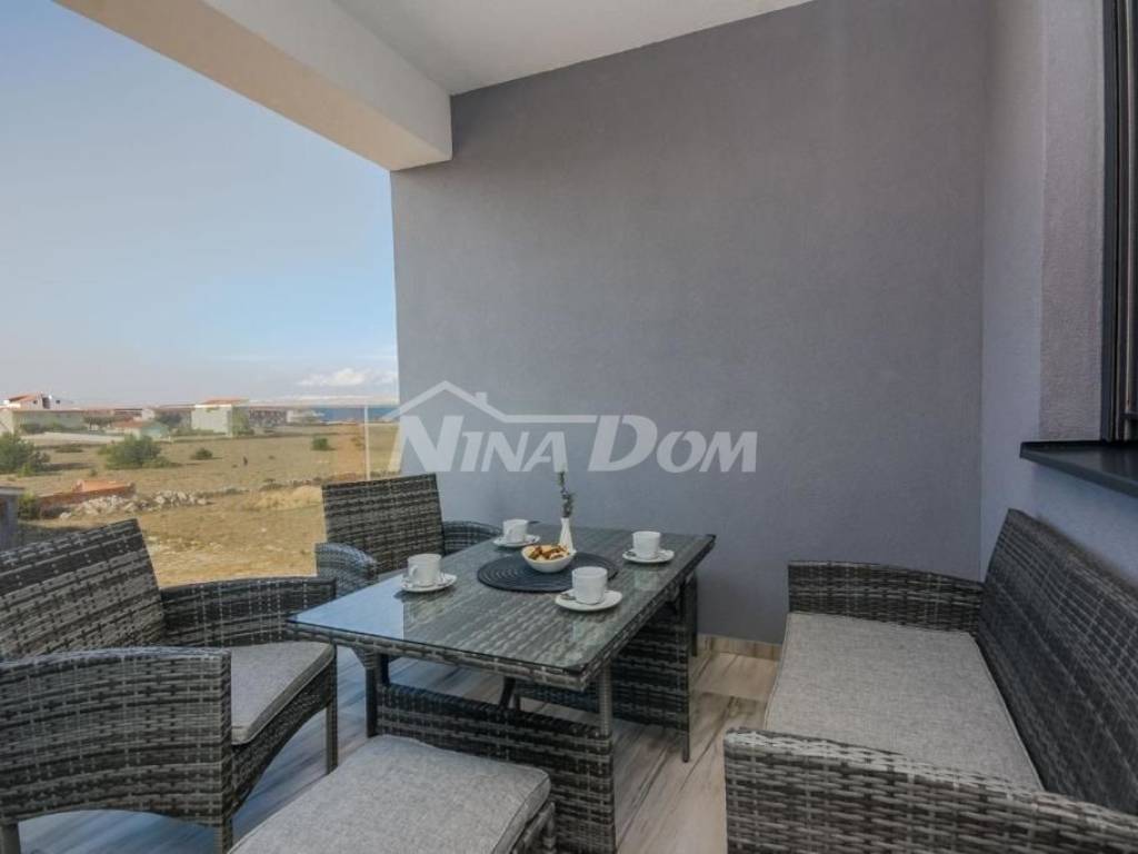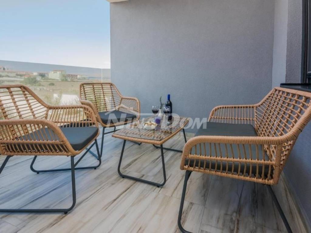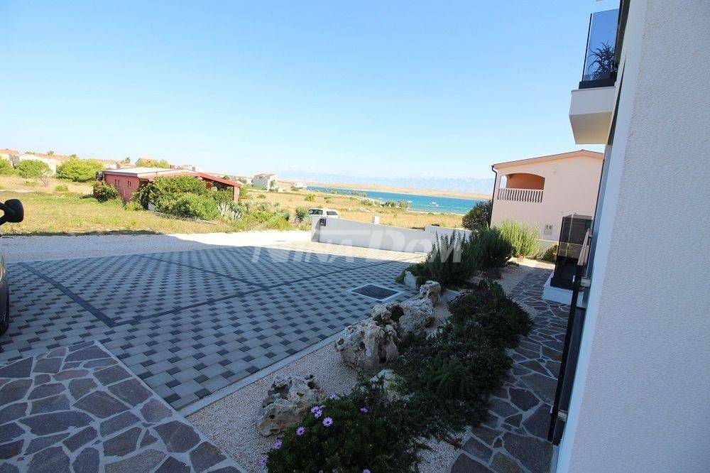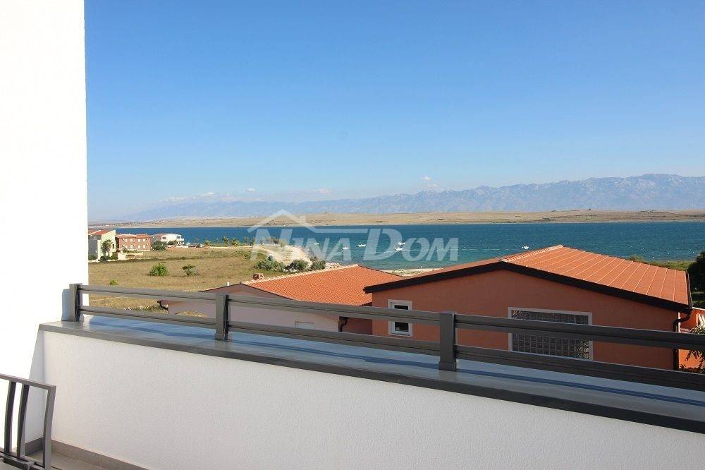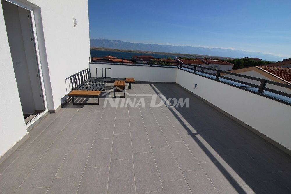 Drugi kat; apartman s dvije spavaće sobe. dvije kupaonice, wc, kuhinja s dnevnim boravkom, dvije terase od koje je jedna natkrivena i jedna otvorena s pogledom na more i Velebit.