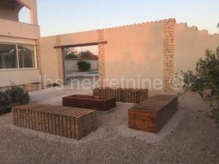Okućnica je pomno uređena s nasadima maslina, palmama i autentičnim mediteranskim biljem. U prednjem dijelu nalazi se parking, dok se u stražnjem dijelu nalazi bazen s vanjskim tušem, okružen zelenilom. Cijela parcela ograđena je visokim zidovima, što osigurava potpunu privatnost i mir.