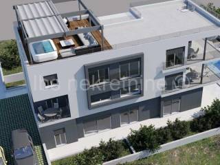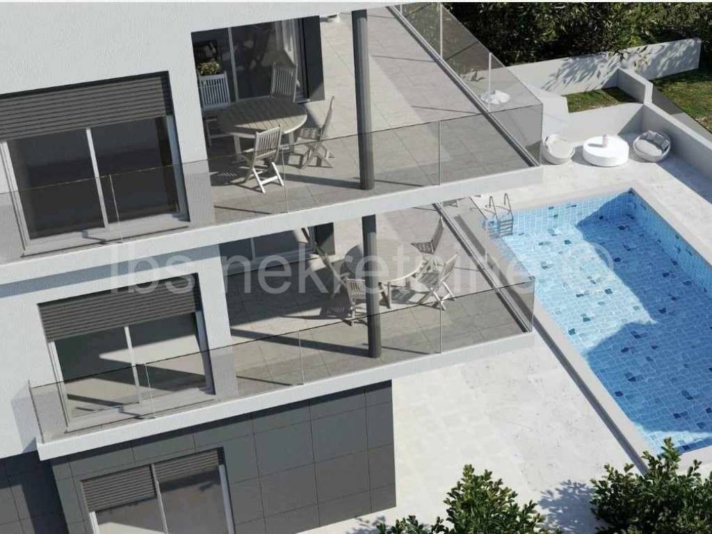 The apartment is located on the ground floor of a smaller, newly built building and consists of a kitchen, dining room and living room, two bedrooms, a bathroom, a covered balcony and a large garden (approx. 200 m2) with its own pool.