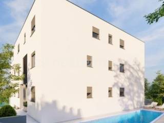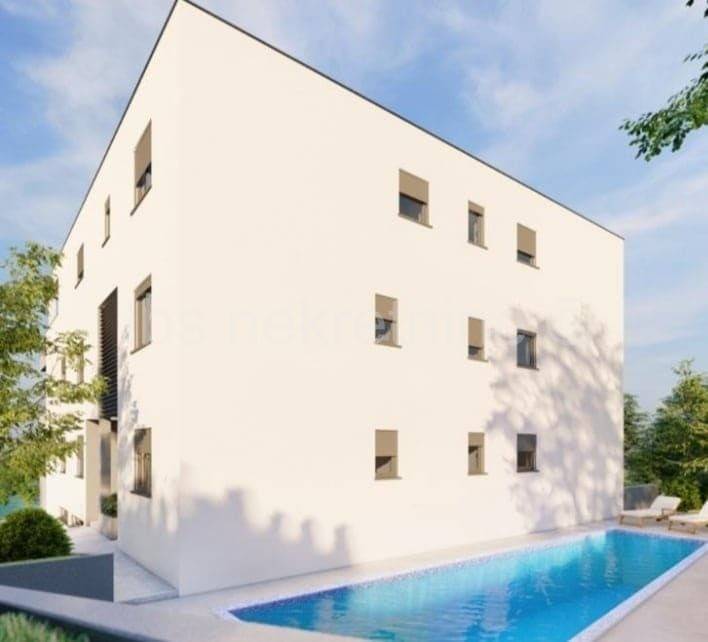 A comfortable two-bedroom apartment is for sale on the ground floor of a residential building in Okrug Gornji, in an excellent location only 4 km from the UNESCO city of Trogir. The apartment consists of two bedrooms, a bathroom, a living room, a kitchen with a dining room, and a terrace of 24.85 m2.