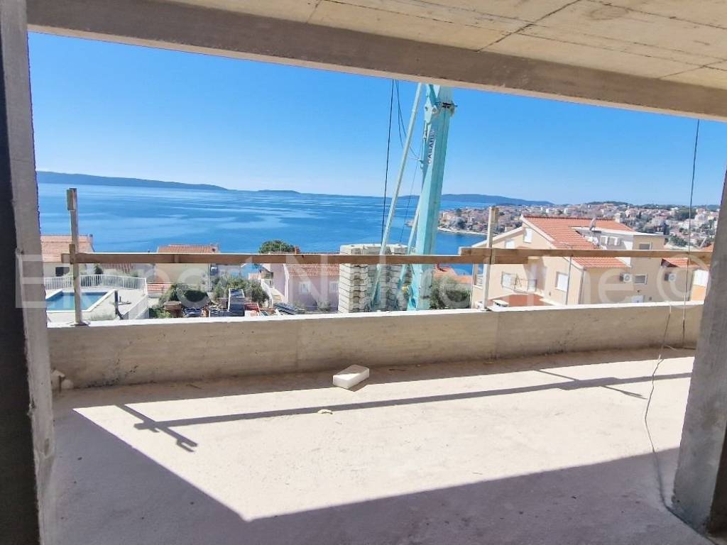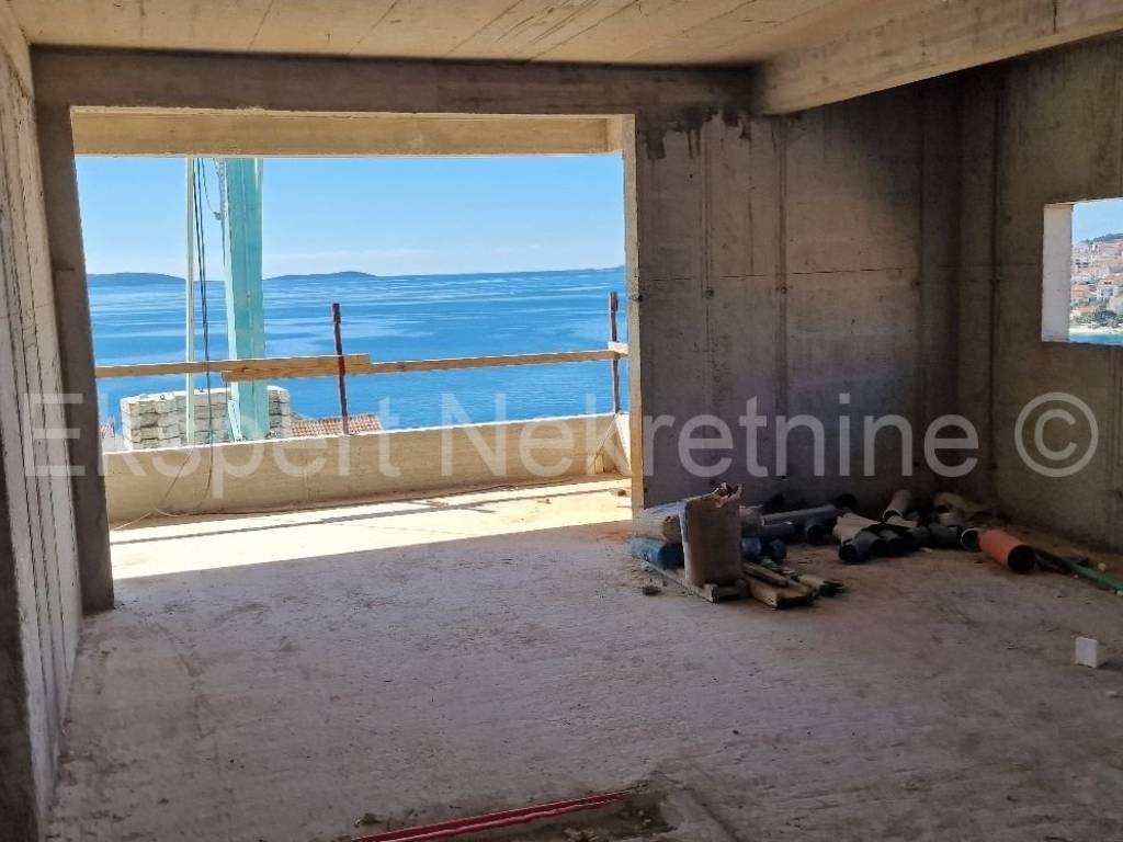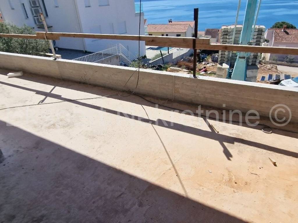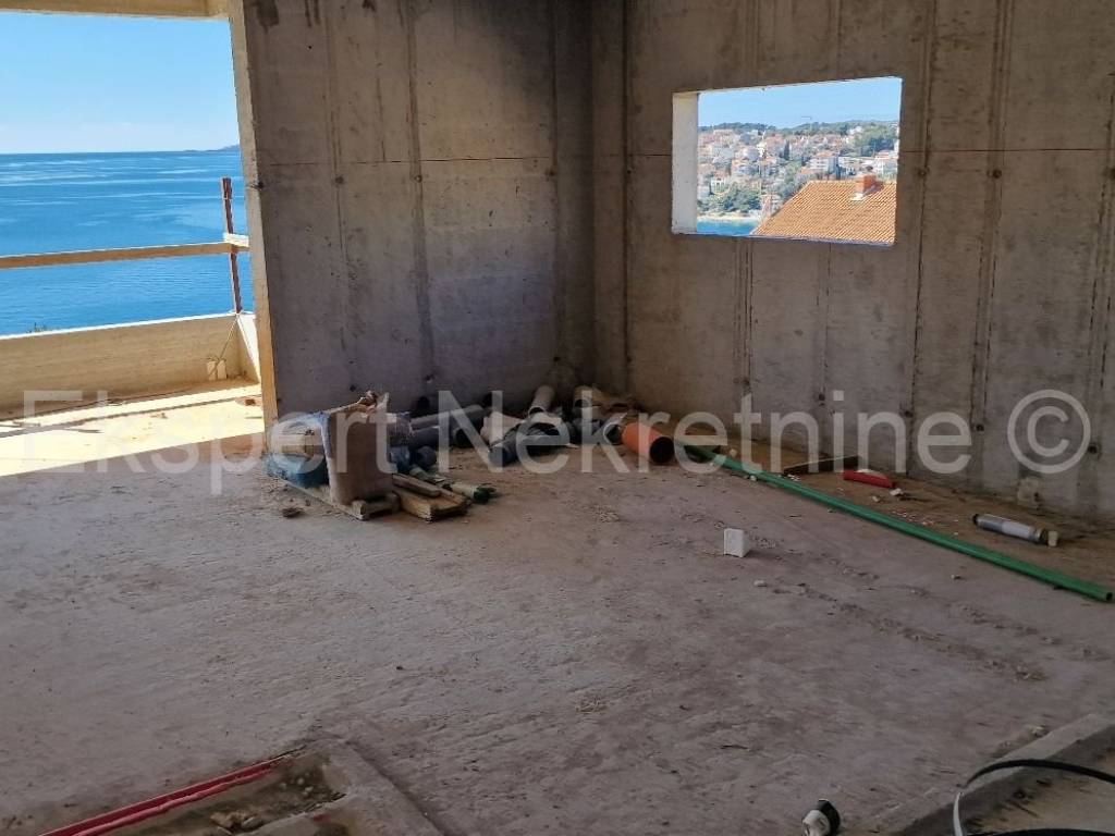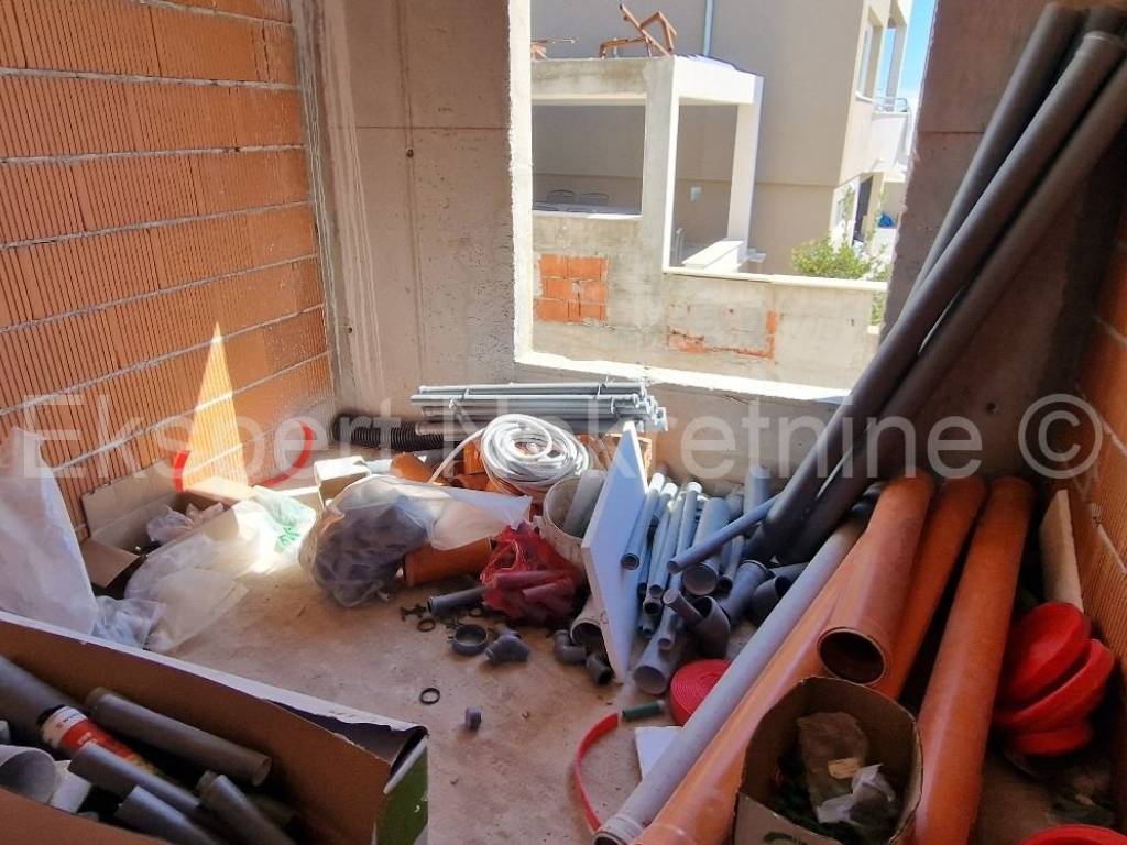 Čiovo, Okrug Gornji, three-bedroom apartment 79 m2 + covered terrace 20 m2 in a new building, only 220 m from the sea and beach with a sea view. The apartment is located on the first floor of the building, east-south-west-north oriented, and consists of three bedrooms, one of which has its own bathroom, bathroom, hallway, kitchen with dining room and large living room and a large terrace (20m2) with a beautiful and open view of the sea and islands. The apartment has an open view of the sea and islands. The apartment also has one large outdoor parking space.The building is located in an excellent location, south side of Čiovo, only 220 m from the sea and beach. Quality construction (quality ceramics, underfloor heating throughout the apartment, air conditioning in all rooms, mosquito nets, electric shutters, PVC joinery, etc.). The building is in the phase of rough construction works and the planned completion is the end of 2025.Payment by construction stages. Ownership in order.For more information, contact the agency.