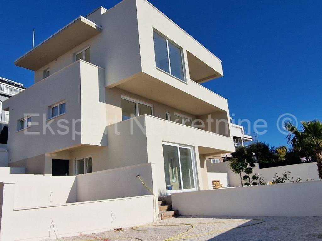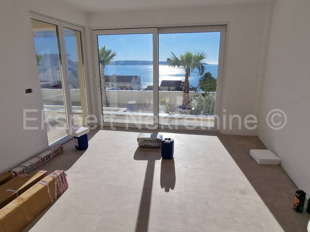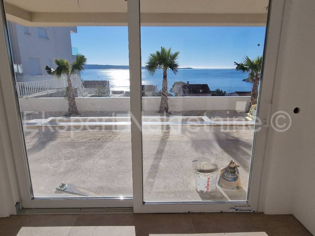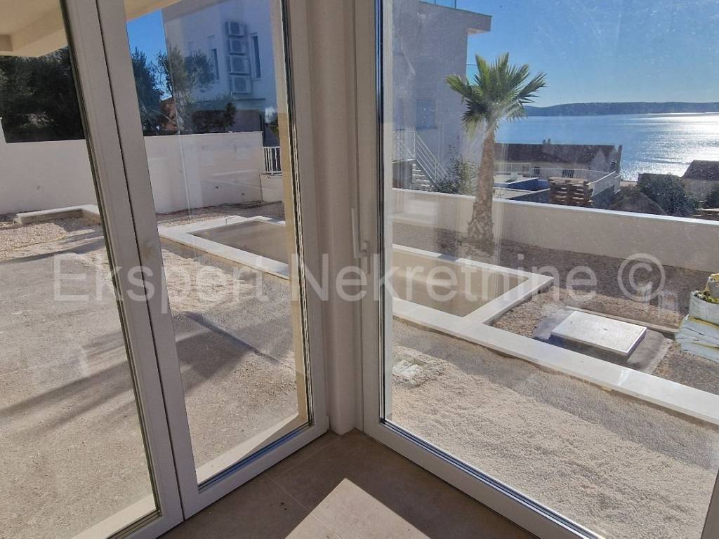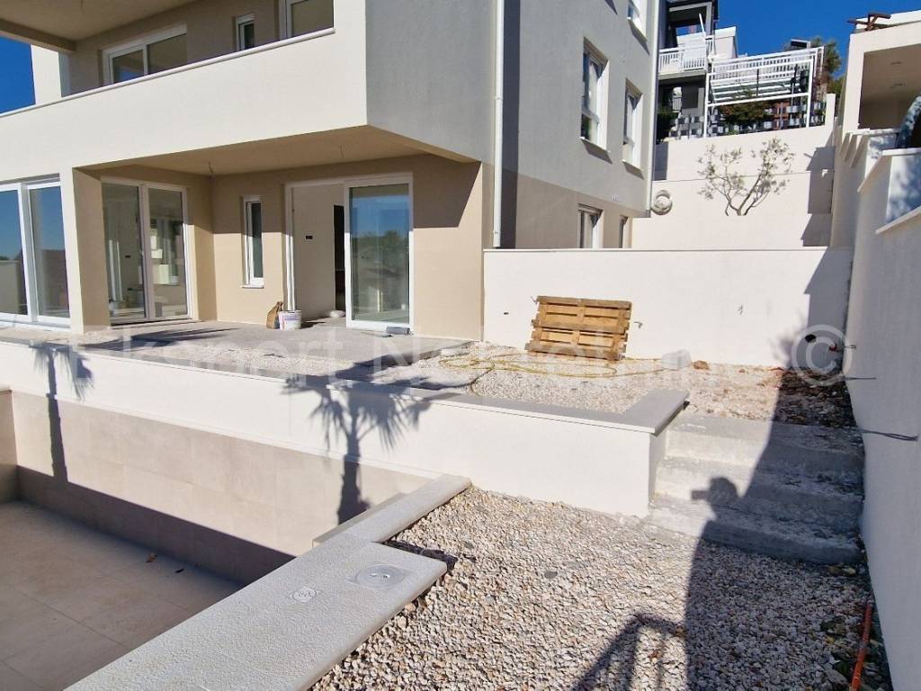 Čiovo, Okrug Gornji, three-bedroom apartment 84 m2 + terrace 30 m2 plus large garden 202 m2 plus private pool 19 m2 in a new building, only 220 m from the sea and beach with sea view. The apartment is located on the ground floor of the building, east-south-west oriented, and consists of three bedrooms, one of which has its own bathroom, bathroom, hallway, kitchen with dining room and large living room and terrace (30m2) and garden (202 m2) and pool (19m2). Although the apartment is on the ground floor, it has an open view of the sea and islands. The apartment also has one large outdoor parking space.The building is located in a great location, south side of Čiovo, only 220 m from the sea and beach. Quality construction (quality ceramics, underfloor heating in the entire apartment, air conditioning in all rooms, mosquito nets, electric blinds, PVC joinery, etc.). The building is in the phase of rough construction works and the planned completion is the end of 2025.Payment by construction stages. Ownership in order.For more information, contact the agency.